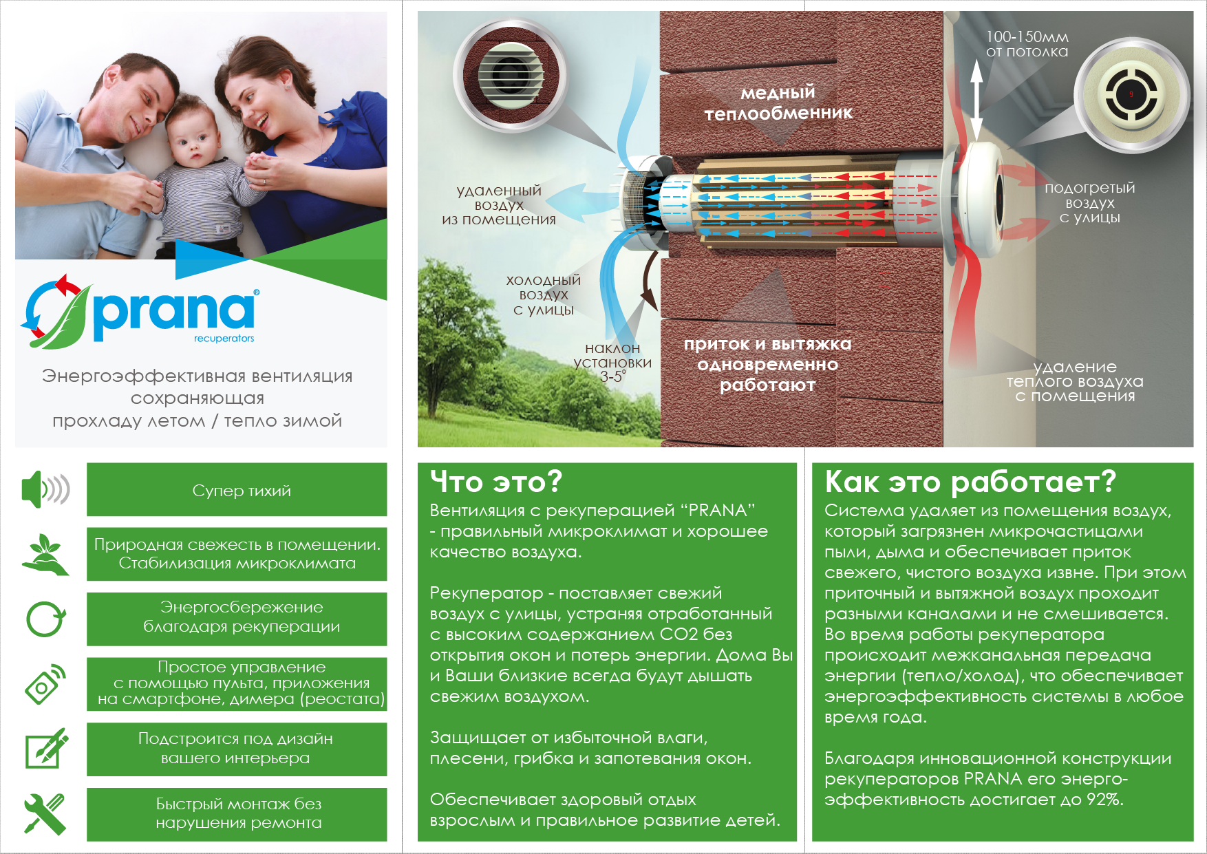 Рекуператоры Prana: - инновационная разработка в отрасли вентиляции, кондиционирования и отопления. - энергосберегающая система вентиляции, которая удаляет из помещения воздух, загрязнённый микрочастицами пыли и дыма, обеспечивает постоянный приток свежего воздуха и нормализует уровень влажности в помещении, тем самым помогает избавиться от плесени и грибка на стенах, и предотвращает запотевание окон, возвращает комфортный микроклимат. - позволяет снизить затраты на обогрев жилья зимой и охлаждения летом благодаря эффективному медному теплообменнику.