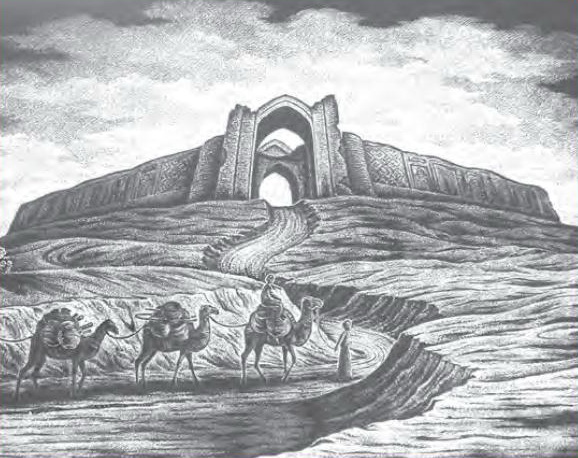 Каждая новая работа Алымджана привлекает внимание. На одном из произведений воссоздано прибытие каравана к средневековому постоялому двору Дая-хатын на севере Лебапа.
