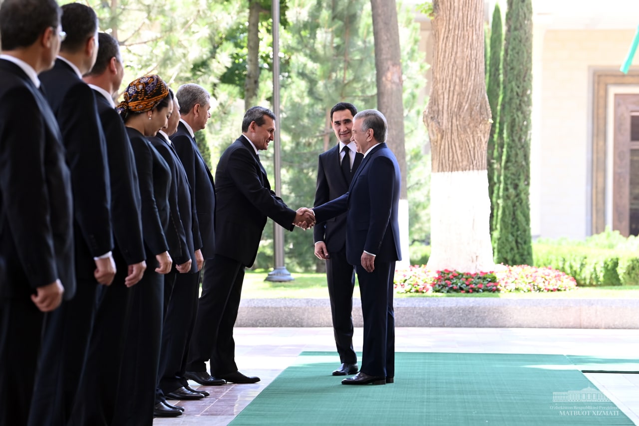 Президент Республики Узбекистан Шавкат Мирзиёев встретил Президента Туркменистана Сердара Бердымухамедова в резиденции «Куксарой» (Зеленый дворец), сообщается на официальном сайте узбекского лидера.
