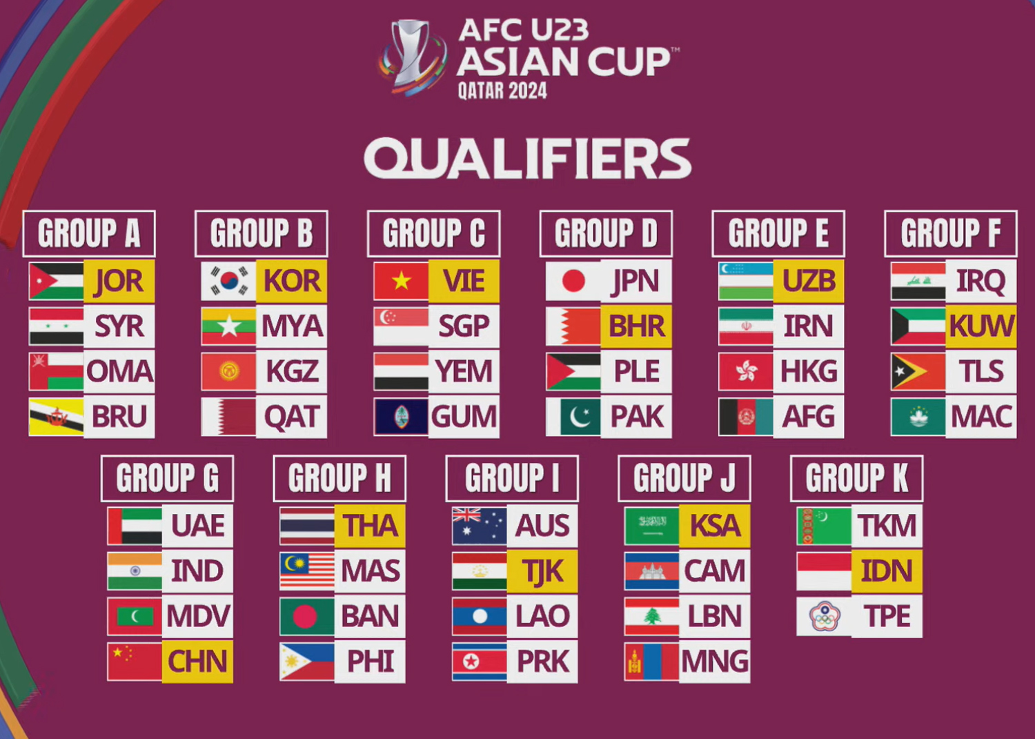 По итогам жеребьевки 43 команды были разделены на одиннадцати групп. Победители групп, а также четыре лучшие сборные среди занявших вторые места получат путевки в финальную часть Кубка Азии-2024, которая пройдет в следующем году в Катаре.