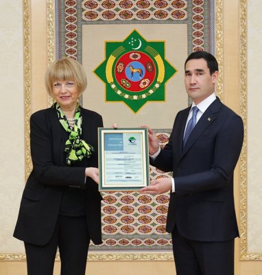 Президент Сердар Бердымухамедов сердечно поздравил Хельгу Шмид с открытием нового здания Центра ОБСЕ в Ашхабаде, выразив также признательность за вручение сертификатов Международному морскому порту Туркменбаши и городу Аркадагу. Напомним, порт Туркменбаши удостоился сертификата EcоPorts, а город Аркадага соответствующего документа о присоединении к проекту «Развитие устойчивых, зелёных, климатически благоприятных городов с инновационными решениями в регионе Организации по безопасности и сотрудничеству в Европе».