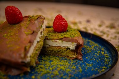 Хрустящее, нежное тесто кадаиф, пропитанное сладким сиропом, в сочетании с насыщенным вкусом фисташек и изысканностью бельгийского шоколада создает неповторимую симфонию вкусов. Каждый кусочек этого десерта – это настоящее наслаждение для сладкоежек.