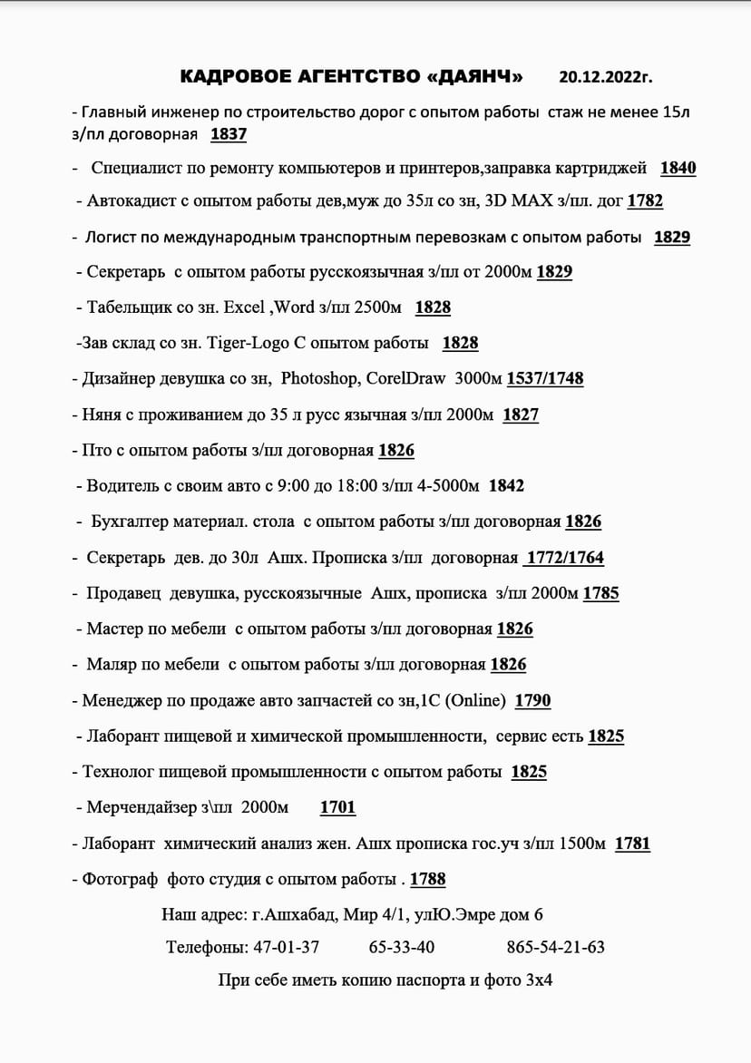 Address:Ашгабат. Мир 2/1 ул. Юнус эмре 6 дом подвалное помищение. Тел: 470137. 653340. + 99365542163
