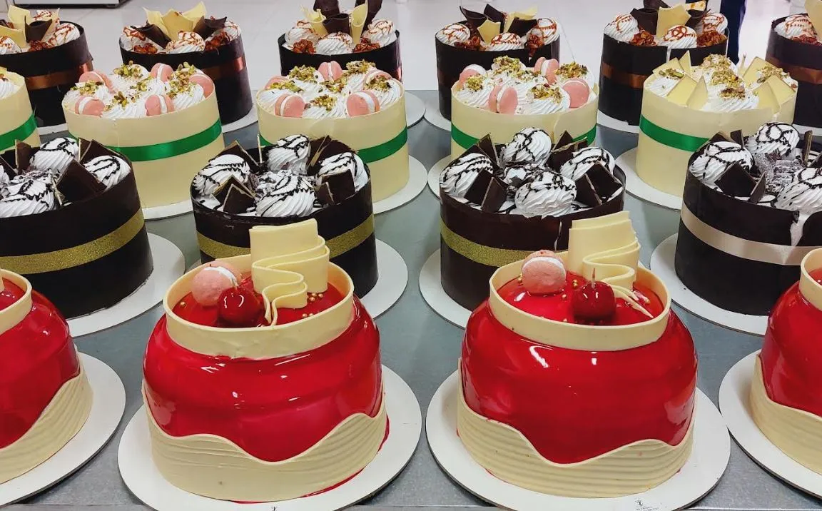 The line features classic cream cakes, fruit variations, chocolate desserts, popular mousse creations, and custom-made cakes with decorative designs. Orders are accepted for both family events and corporate celebrations.