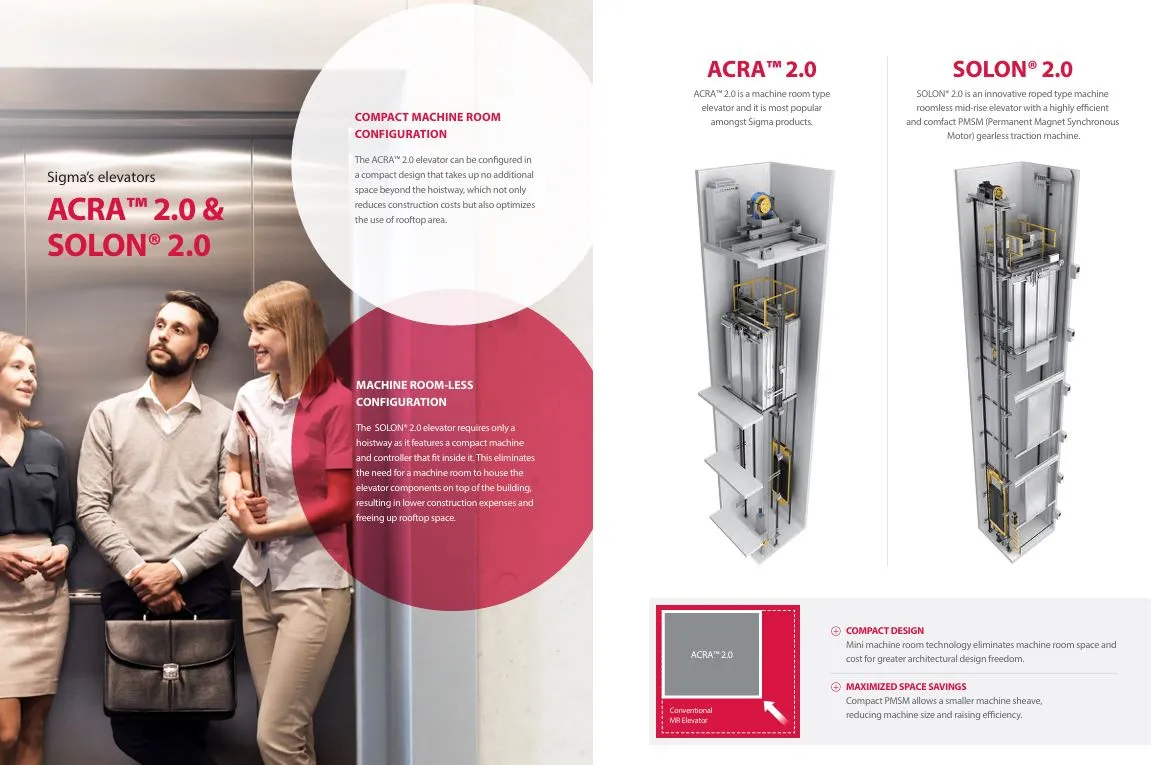 Today, Sigma offers a wide range of elevators (passenger, freight, hospital, panoramic, cottage, and car), escalators, and moving walkways with a focus on safety, energy efficiency, and innovation. Key models include the IRIS NR for the Russian and CIS markets, the SOLON NV machine-room-less system, the MUSE Dynamic, and the updated ACRA 2.0 and SOLON 2.0 (2023). The company has factories in Korea (Changwon) and China (Hangzhou), as well as a global distributor network.