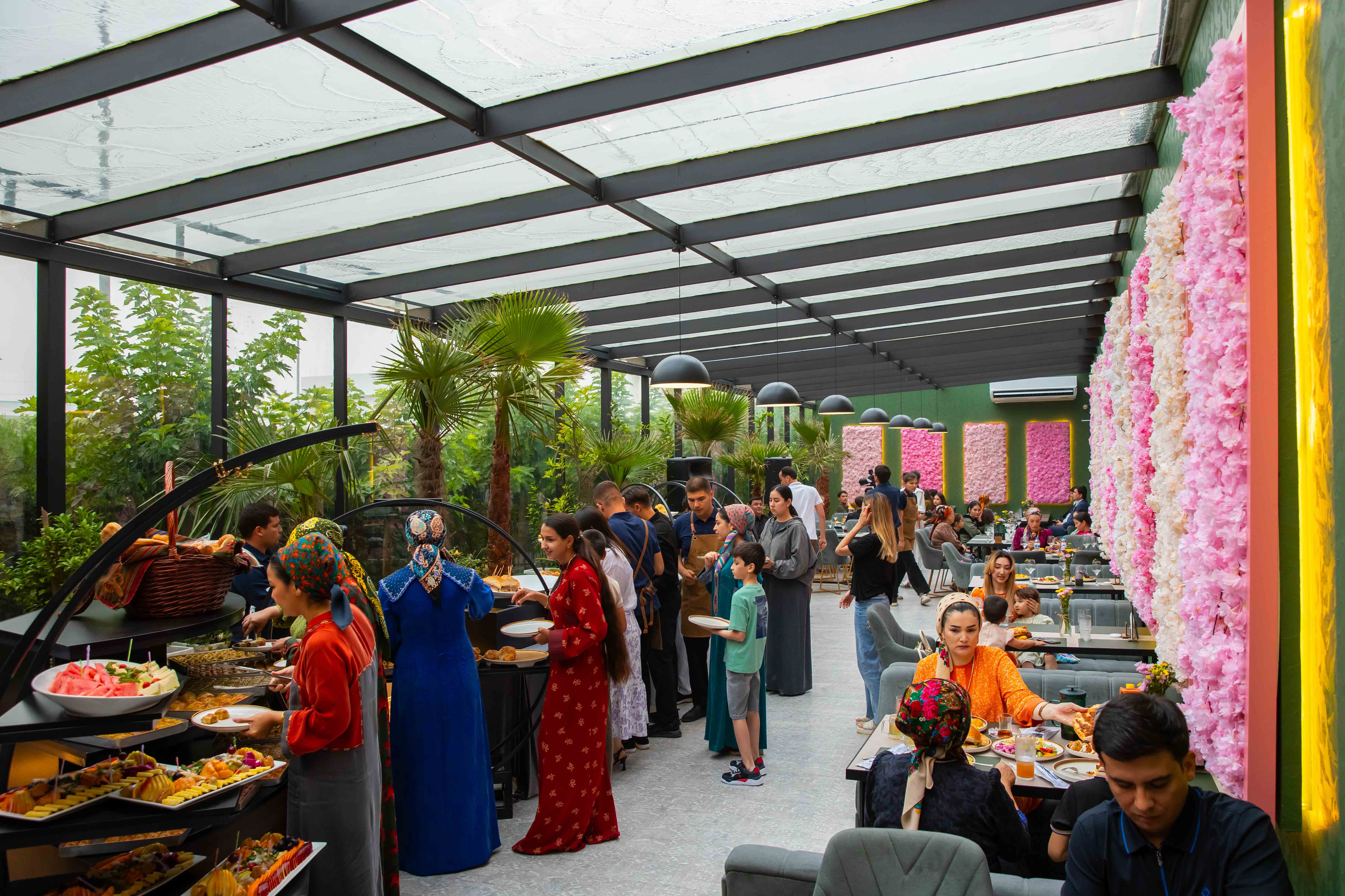 Заведение предлагает блюда туркменской, турецкой, итальянской и русской кухни, составленные с учётом вкусовых предпочтений гостей. В меню — разнообразные завтраки, горячие блюда, стейки, рыба, гарниры, супы, холодные закуски, мезе, блюда на мангале, паста, выпечка и фастфуд. Особая гордость — 21 вид фирменной турецкой пахлавы. Также доступна доставка по городу.