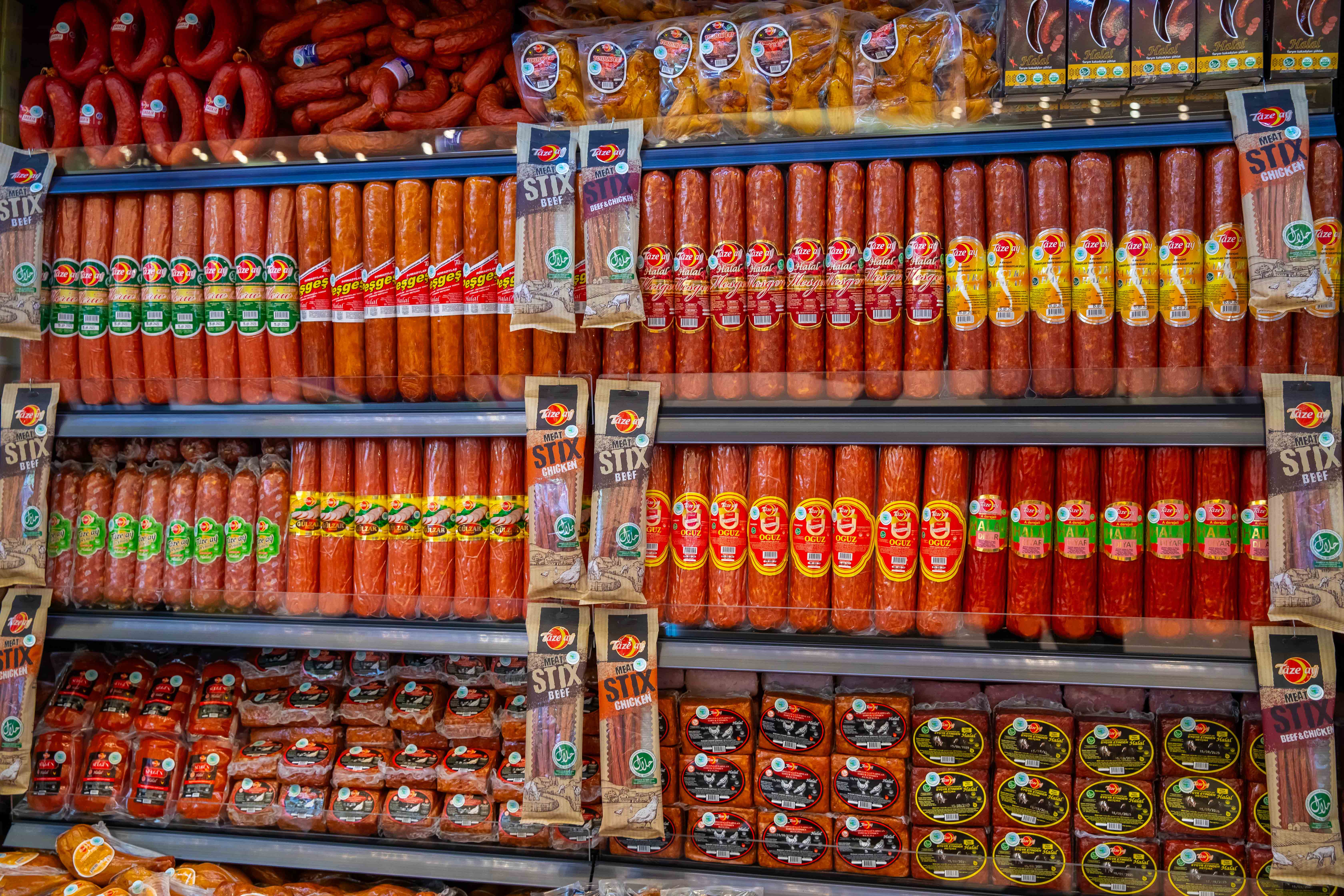 Среди экспонатов — новинки колбас под названиями Talyp, Büzmeýin и «Hindiguş». Особое внимание посетителей привлекает крупнейшая колбаса весом в рекордные 35–40 килограммов и длиной около одного метра.