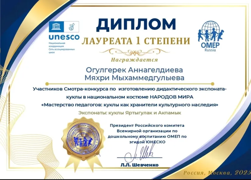 Воспитатели детского сада № 13 Векильбазарского этрапа Марыйского велаята Огулгерек Аннагельдыева и Мяхри Мухамедгулыева приняли участие в конкурсе «Мастерство педагогов: куклы – хранители культурного наследия», который проводился Российским комитетом Всемирной организации дошкольного образования (Organisation Mondiale pour L’Education Pre-Scolaire) под эгидой ЮНЕСКО в рамках фестиваля «Маленькие послы большого мира».