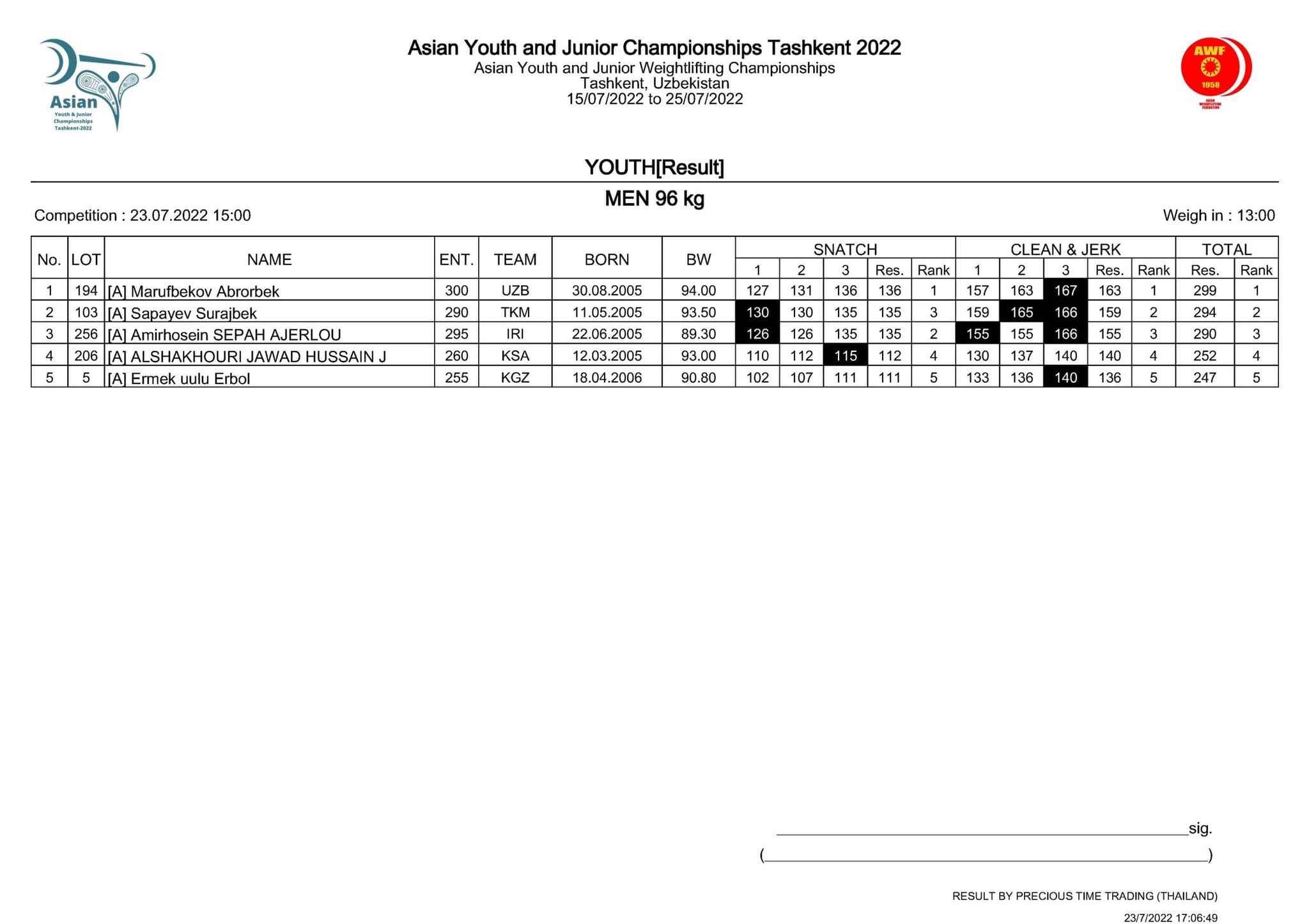 Сапаев стал вторым с результатом 294 кг (135 в рывке + 159 в толчке). Победу одержал Аброрбек Маруфбеков из Узбекистана (299 кг; 136+163), тройку призеров замкнул иранец Амирхоссейн Сепах Аджерлу (290 кг; 135+155).