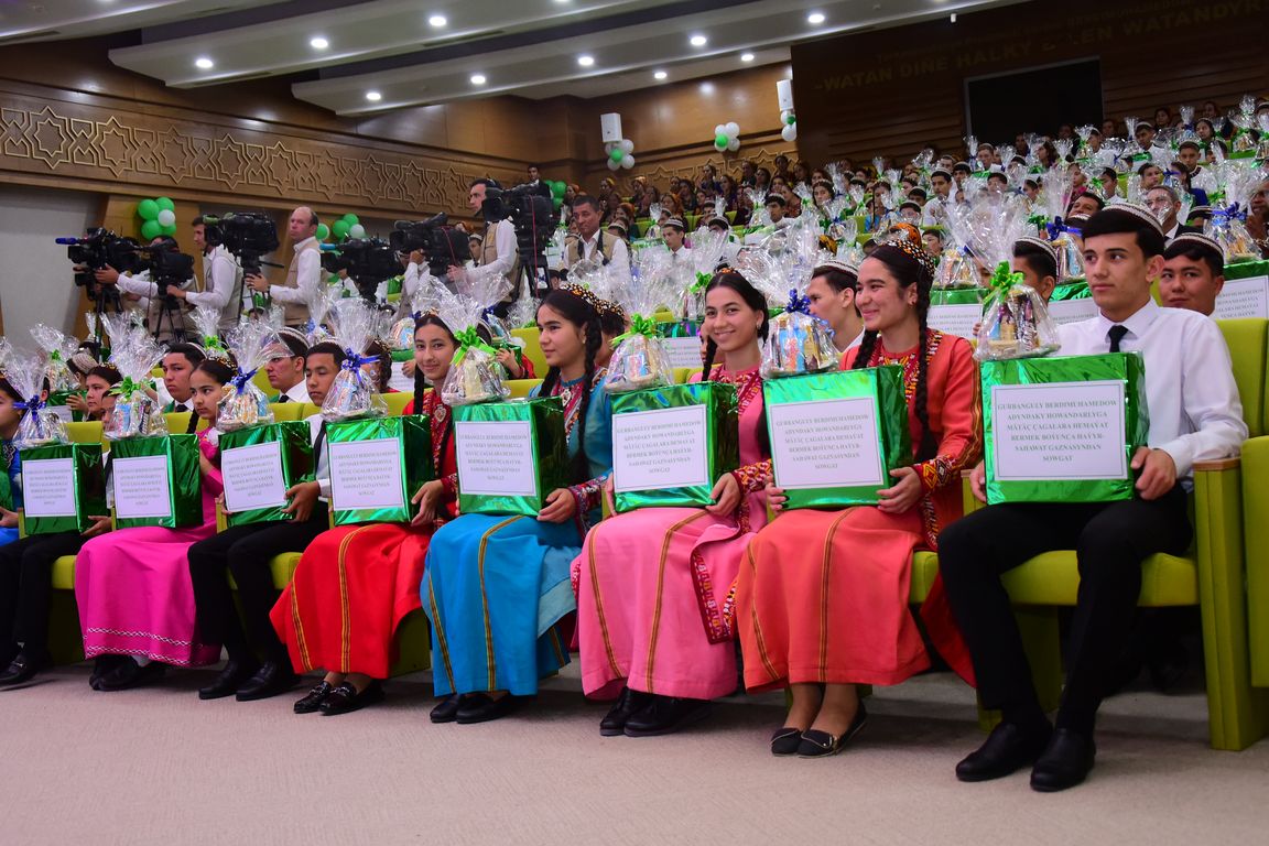 Воспитанникам Дворца от имени Президента Сердара Бердымухамедова и Национального Лидера туркменского народа, председателя Халк маслахаты Гурбангулы Бердымухамедова передаются сердечные поздравления, добрые пожелания и, конечно же, вручаются подарки. Выпускники получили ноутбуки, а остальные ребята – не менее ценные комплекты подарков.