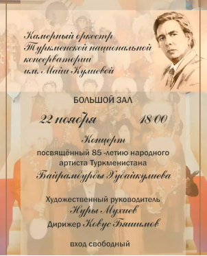 22 ноября в Большом зале Туркменской национальной консерватории им. Майи Кулиевой состоится концерт, посвящённый памяти выдающегося композитора, дирижёра и педагога Байрамдурды Худайкулиева.