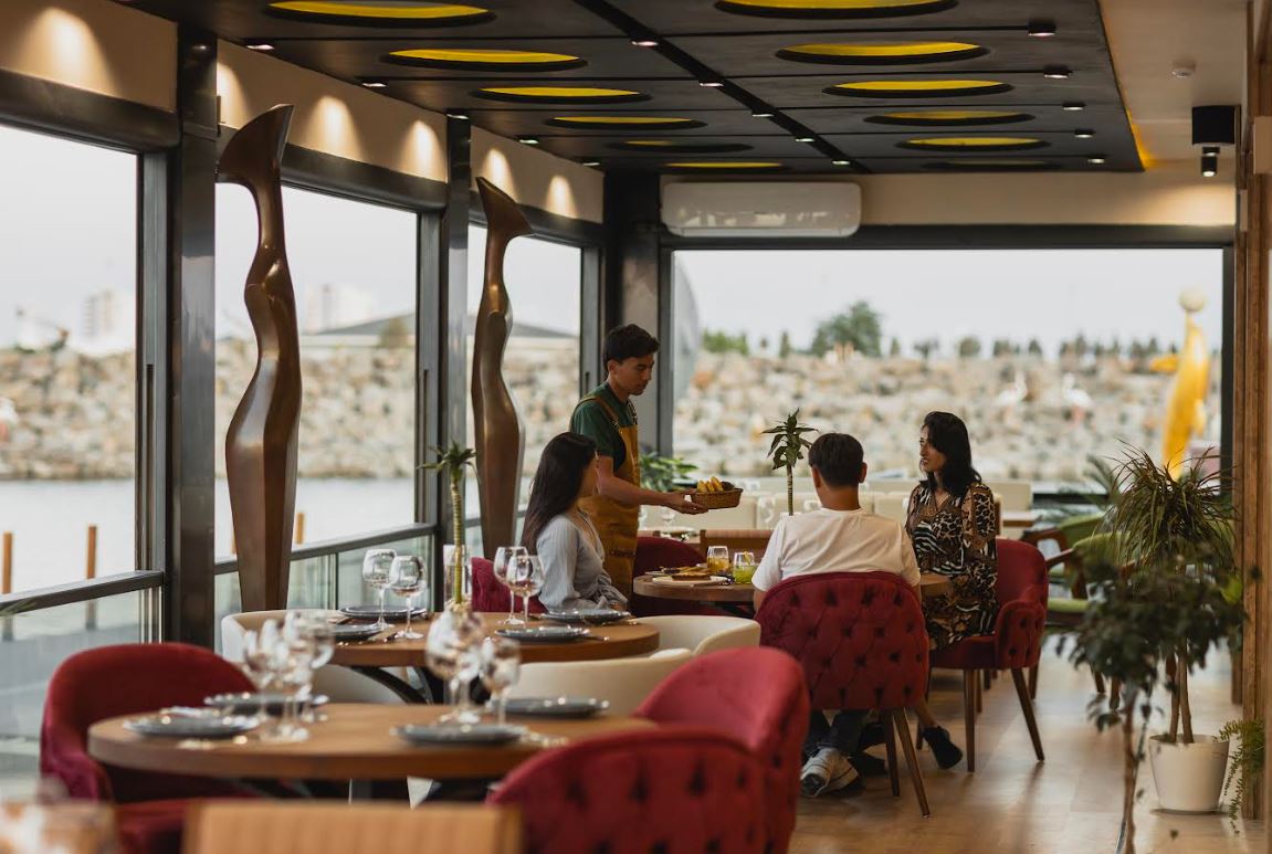 Особенностью ресторана является панорамный вид на воды Каспия, который создает идеальный фон для семейных ужинов, романтических свиданий, деловых встреч и торжественных мероприятий.