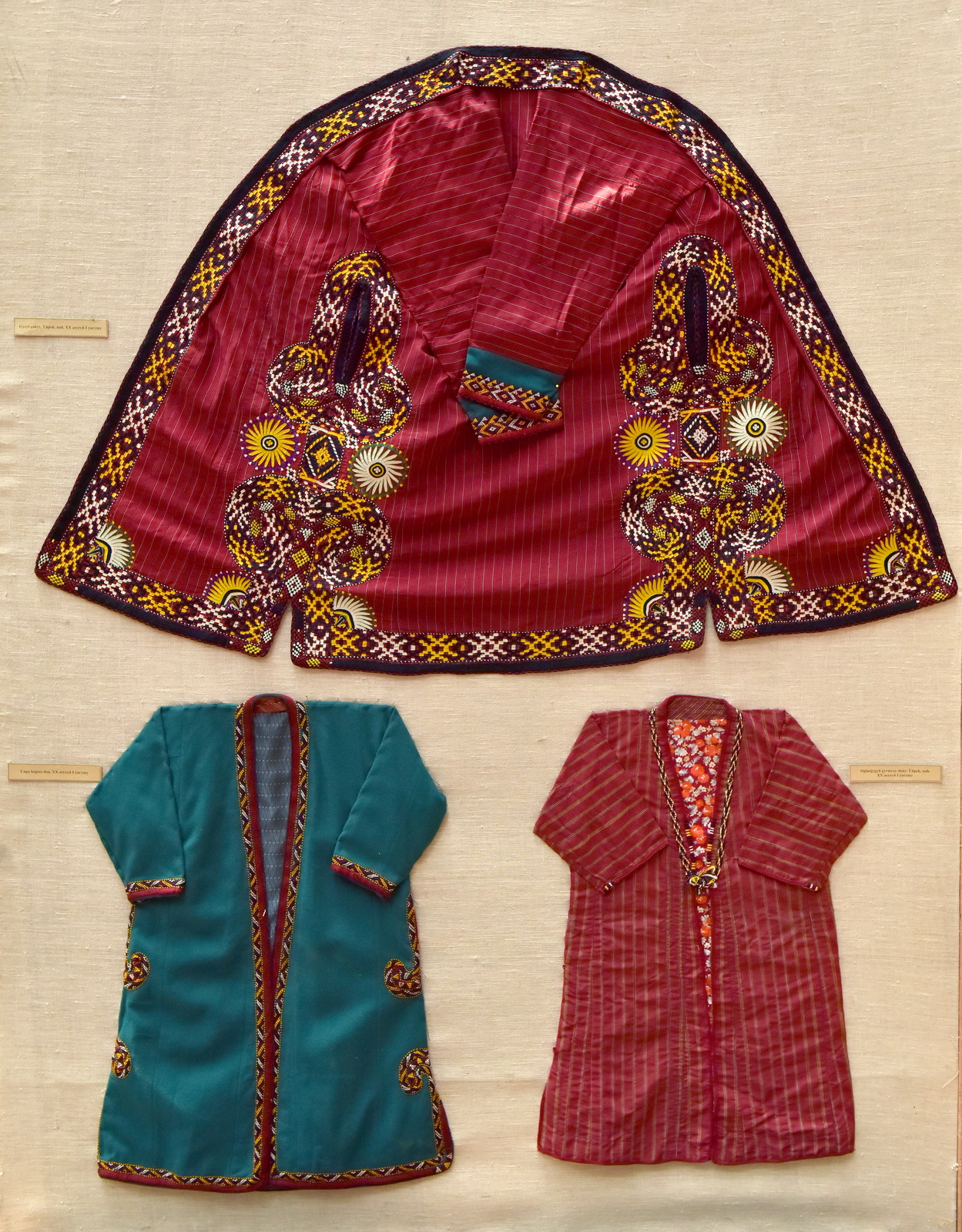 Особое внимание привлекают халаты с национальным орнаментом: желтые с красными и зелеными полосами, хивинские халаты с хлопковой набивкой, шелковые и полушелковые изделия, а также халаты из бараньей и верблюжьей шерсти, демонстрирующие мастерство древних ремесленников.