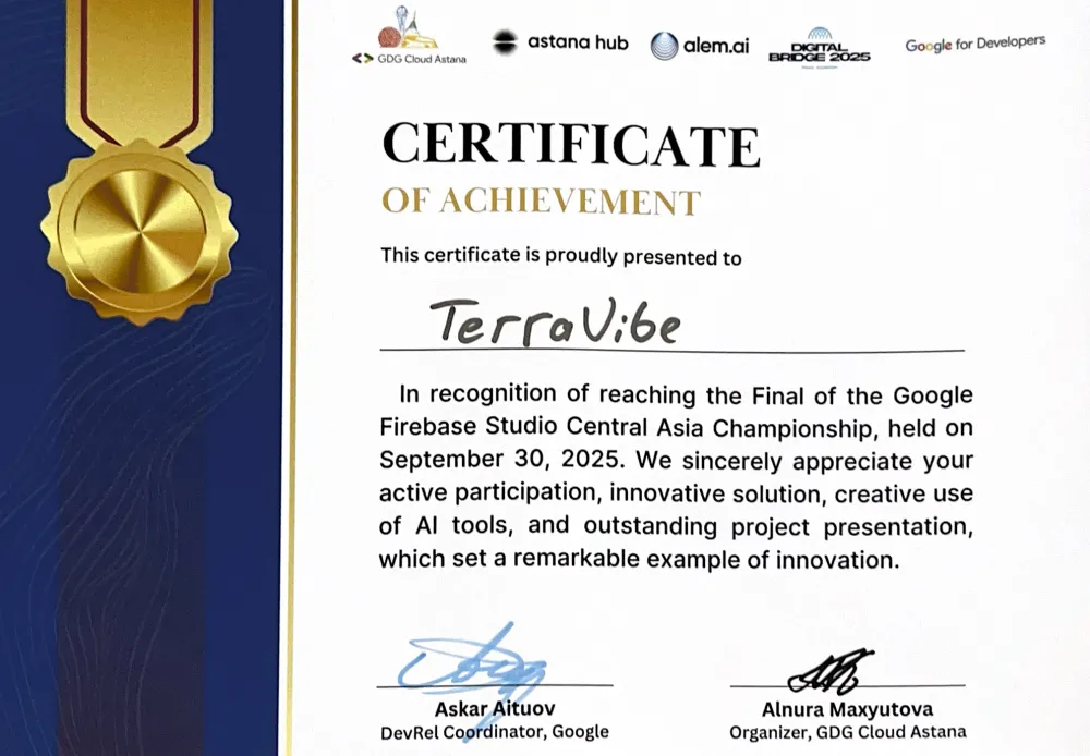 Ребята представили проект под названием TerraVibe и вошли в десятку лучших команд. В финале они заняли почётное 2-е место и были награждены специальными почётными грамотами и денежными призами от компании Google.