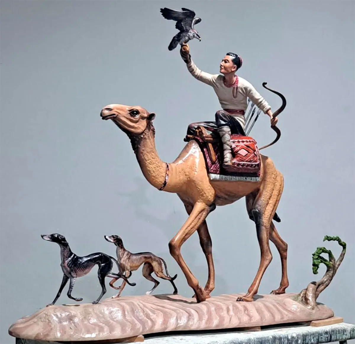 Новая работа известного скульптора, члена Союза художников Туркменистана Байгельды Аннамедова называется «Düýäniň üstündäki awçy» (“Охотник верхом на верблюде“) и посвящена традиции туркменской охоты, в том числе соколиной.