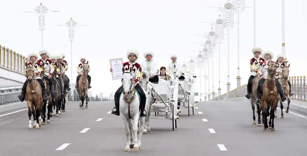 В ходе торжества, развернувшегося на современном мосту, расположенном на пересечении проспектов Геоктепе и Акхан, прозвучали песни и мелодии в сопровождении танцевальных номеров. Участники мероприятия, спустившись с моста в южном направлении, собрались на проспекте Акхан, по которому стройными рядами проезжали члены Группы «Галкыныш» верхом на великолепных скакунах и в фаэтонах.