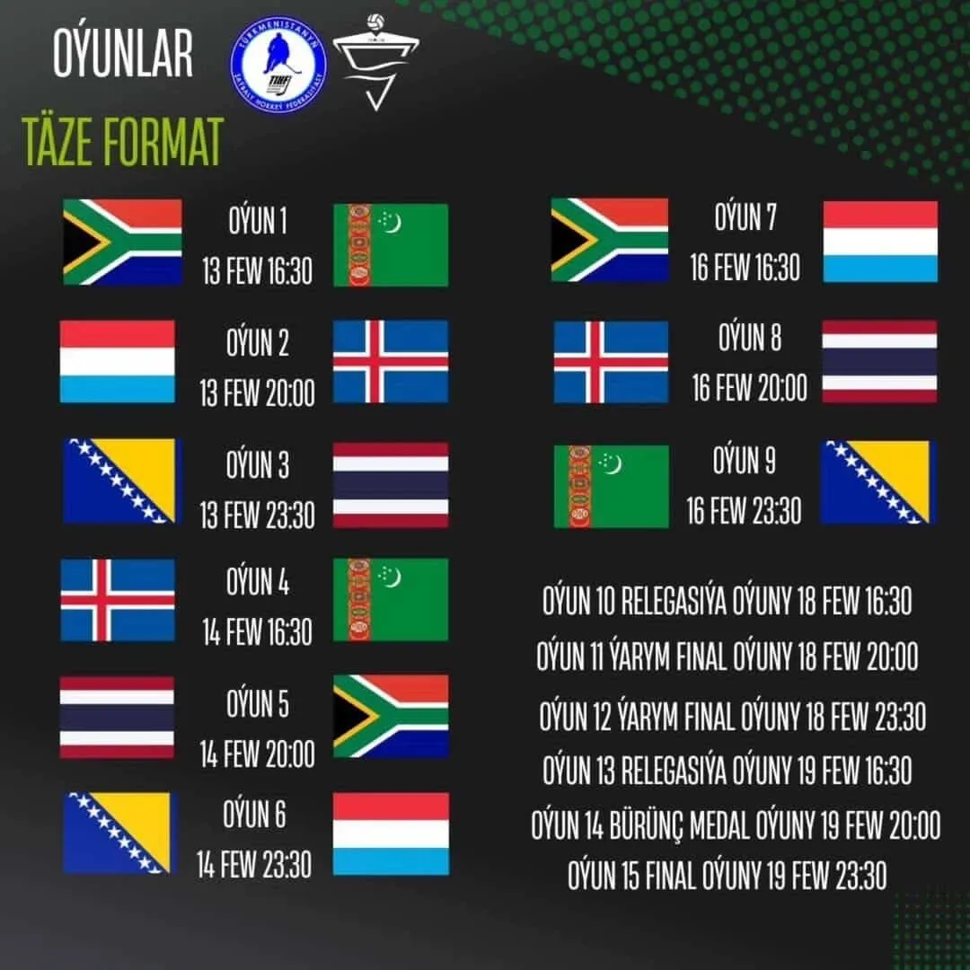 Туркменистан проведет свой первый матч 13 февраля против ЮАР (начало в 16:30 по ашхабадскому времени), 14 февраля встретится с Исландией (16:30), а 16 февраля сыграет против хозяев турнира – сборной Боснии и Герцеговины (23:30). Чемпионат мира продлится до 19 февраля.