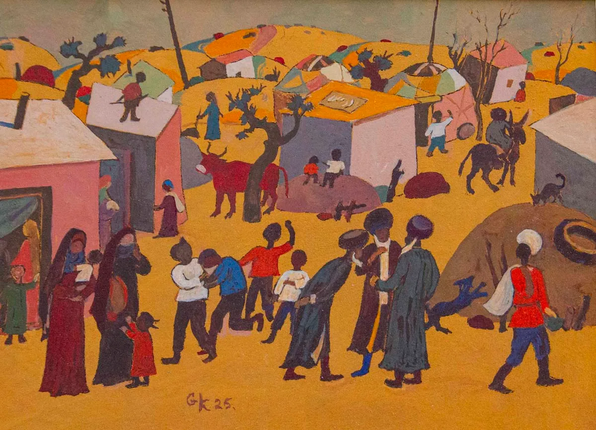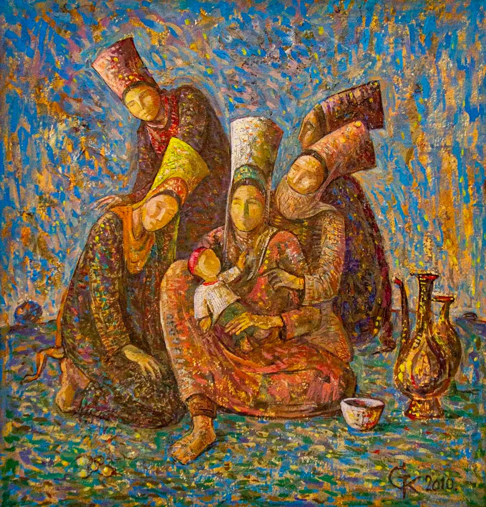 Как сообщает «Туркменистан: Золотой век», у Какагельды Курбангельдыева свой отличительный почерк - прямая перспектива с расчетом на неподвижную точку зрения и работа темперой.