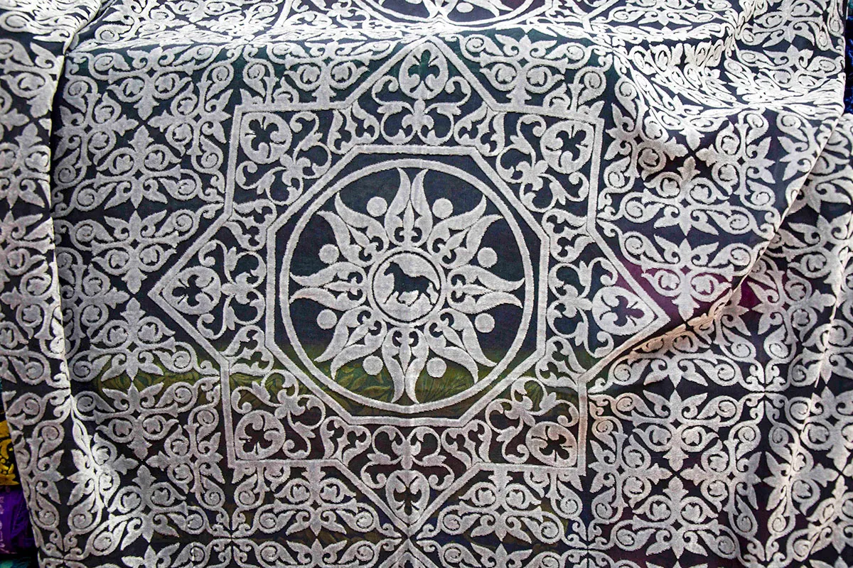 Как сообщает «Туркменистан: Золотой век», в дизайне ткани нашёл отражение символ года – легендарный ахалтекинский конь.