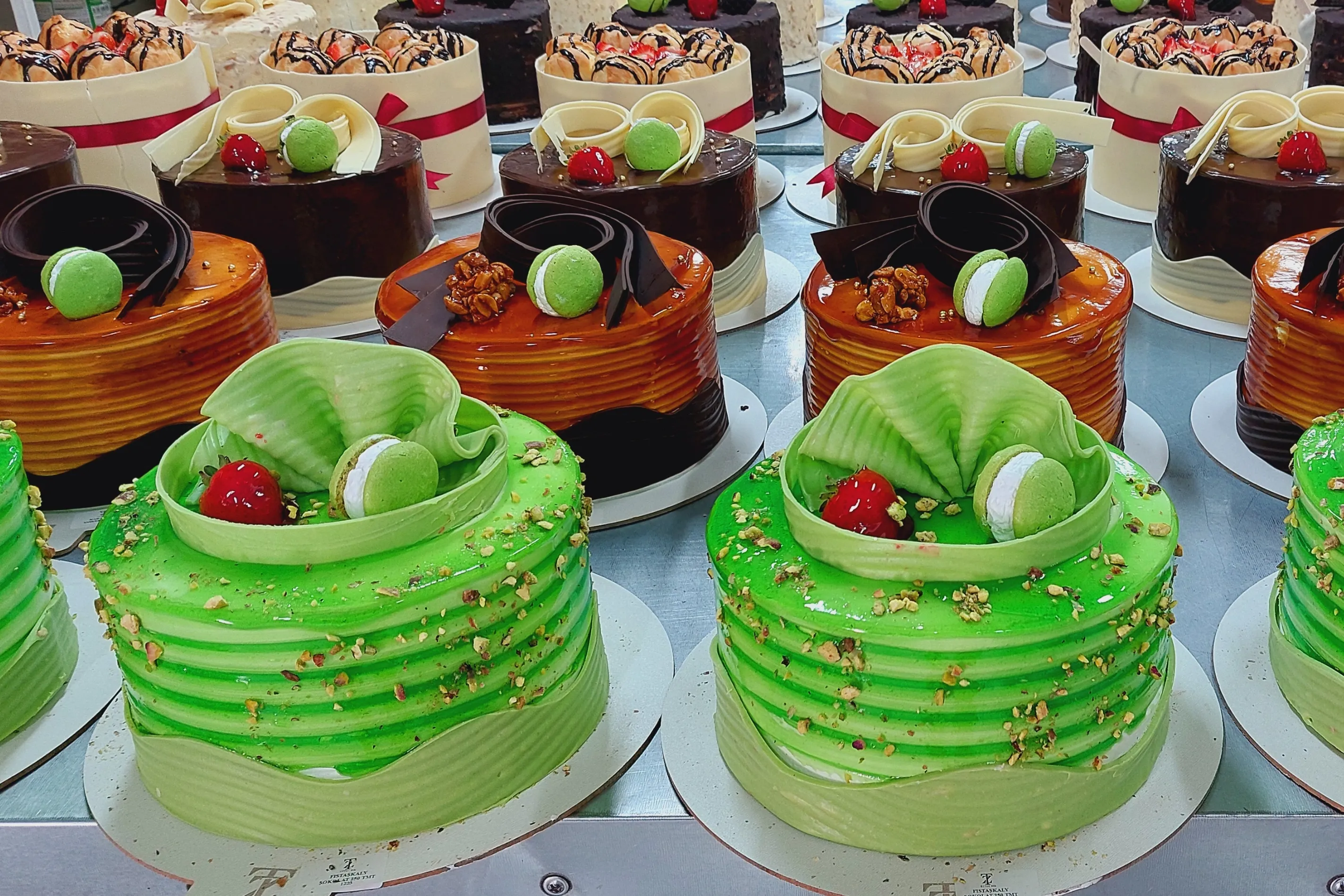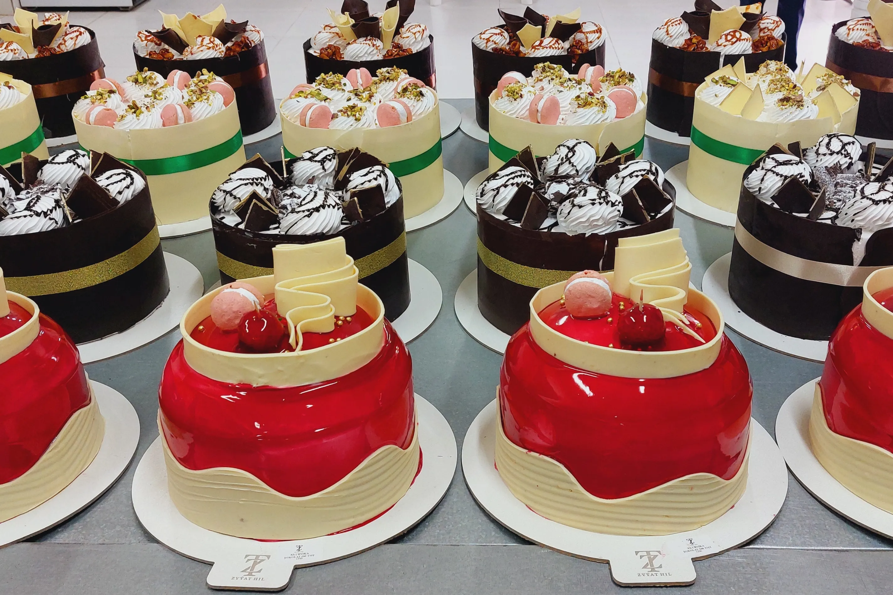 В ассортименте кондитерской представлены разнообразные торты с различными начинками и кремами — ореховыми, ягодными, фруктовыми, шоколадными и сливочными. Покупатели могут выбрать как классические десерты, так и оригинальные варианты.