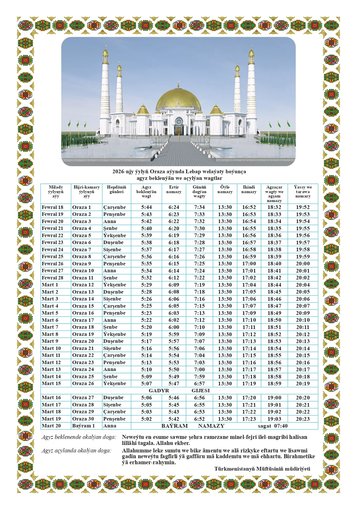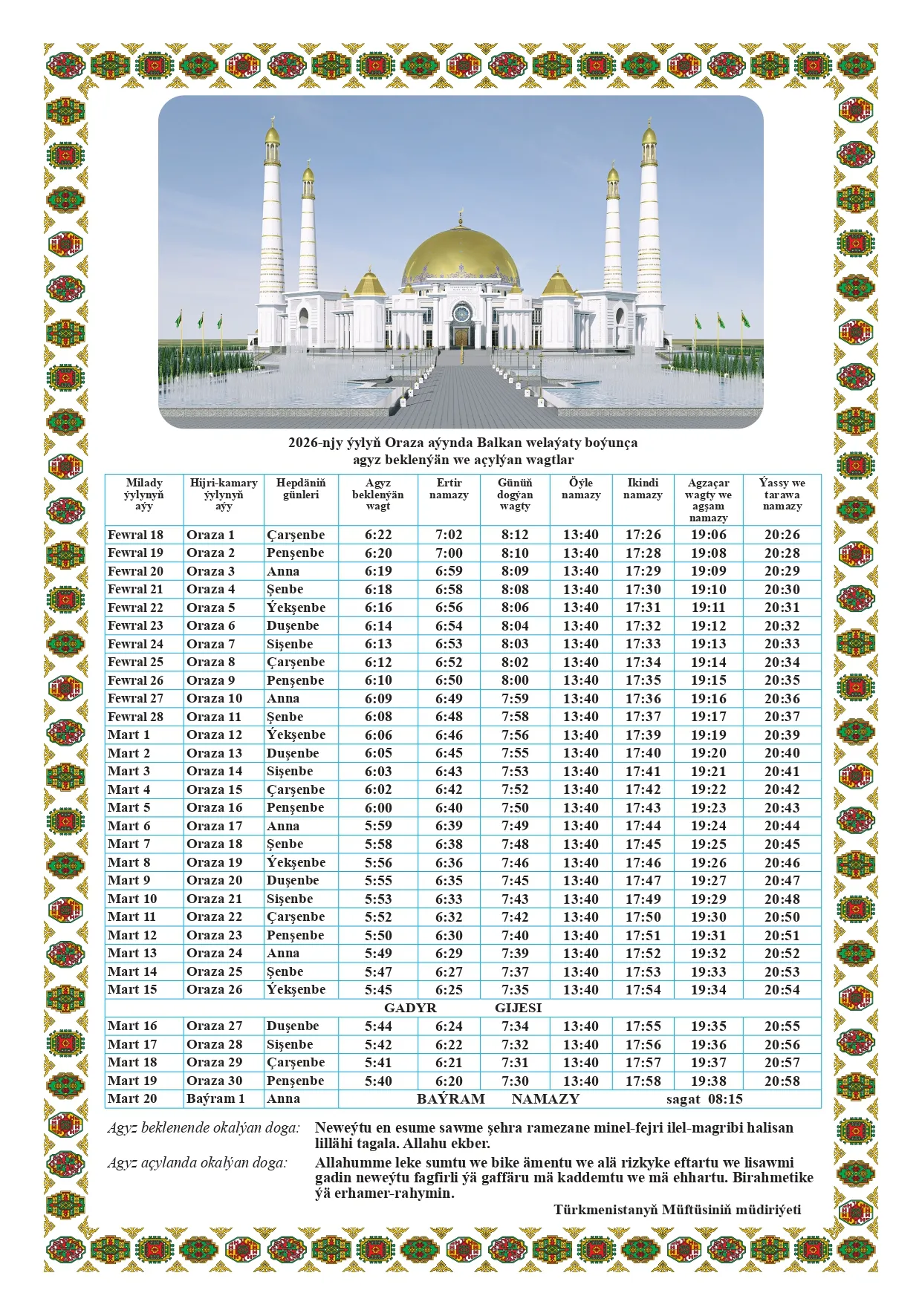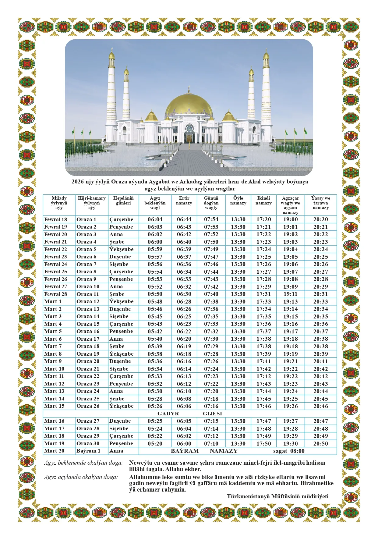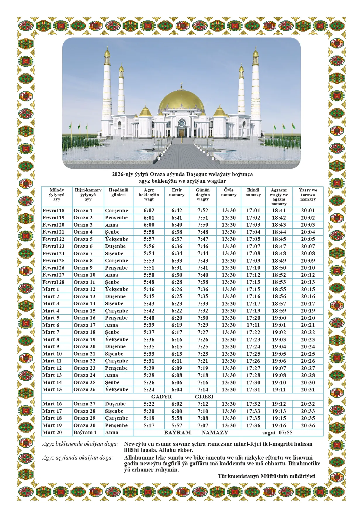 Türkmenistanda hijri senenamasy boýunça 1447-nji ýylyň mukaddes Oraza aýy üçin agyz beklenilýän we agyz açar açylýan wagtlaryň resmi senenamasy neşir edildi. Senenama ýurduň paýtagty Aşgabat şäheri, Arkadag şäheri, şeýle hem bäş welaýat — Ahal, Balkan, Mary, Lebap we Daşoguz welaýatlary üçin aýratynlykda düzüldi.