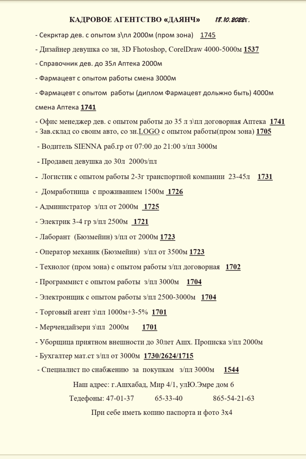 Salgysy:Телефоны для справок : 47-01-37 65-33-40 865-54-21-63 При себе иметь копию паспорта и фото 3х4 Наш адрес: г.Ашхабад, Мир 4\1, улЮнусЭмре дом 6