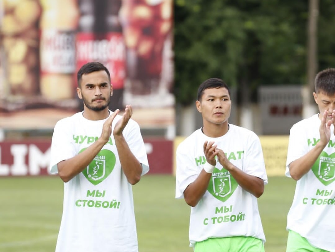 «Abdyş-Atanyň» oýunçylary duşuşygyň öňýanyndaky türgenleşige toparyň hüjümçisi Nurmat Sakebaýewi goldamak üçin niýetlenilen ýörite köýnekçelerde çykdylar.