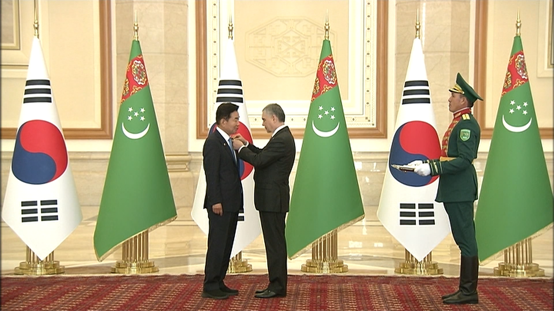 «Watan» habarlar gepleşiginde mälim edilişi ýaly, şu gün Aşgabadyň Maslahat köşgünde ikiçäk we giňişleýin düzümde geçirilen gepleşiklerden soňra, Koreýa Respublikasynyň Milli Assambleýasynyň Başlygy Kim Çjin Pýony Türkmenistanyň «Bitaraplyk» ordeni bilen sylaglamak dabarasy boldy. Sylagy türkmen halkynyň Milli Lideri, Türkmenistanyň Halk Maslahatynyň Başlygy Gurbanguly Berdimuhamedow gowşurdy.