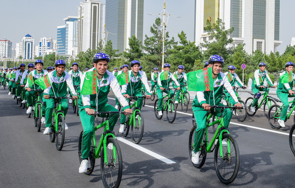Soňra Prezident Serdar Berdimuhamedow köpçülikleýin welosipedli ýörişe badalga berdi. Döwlet Baştutany welosipedli ýörişe gatnaşyjylaryň kerweniniň öňüni çekdi.