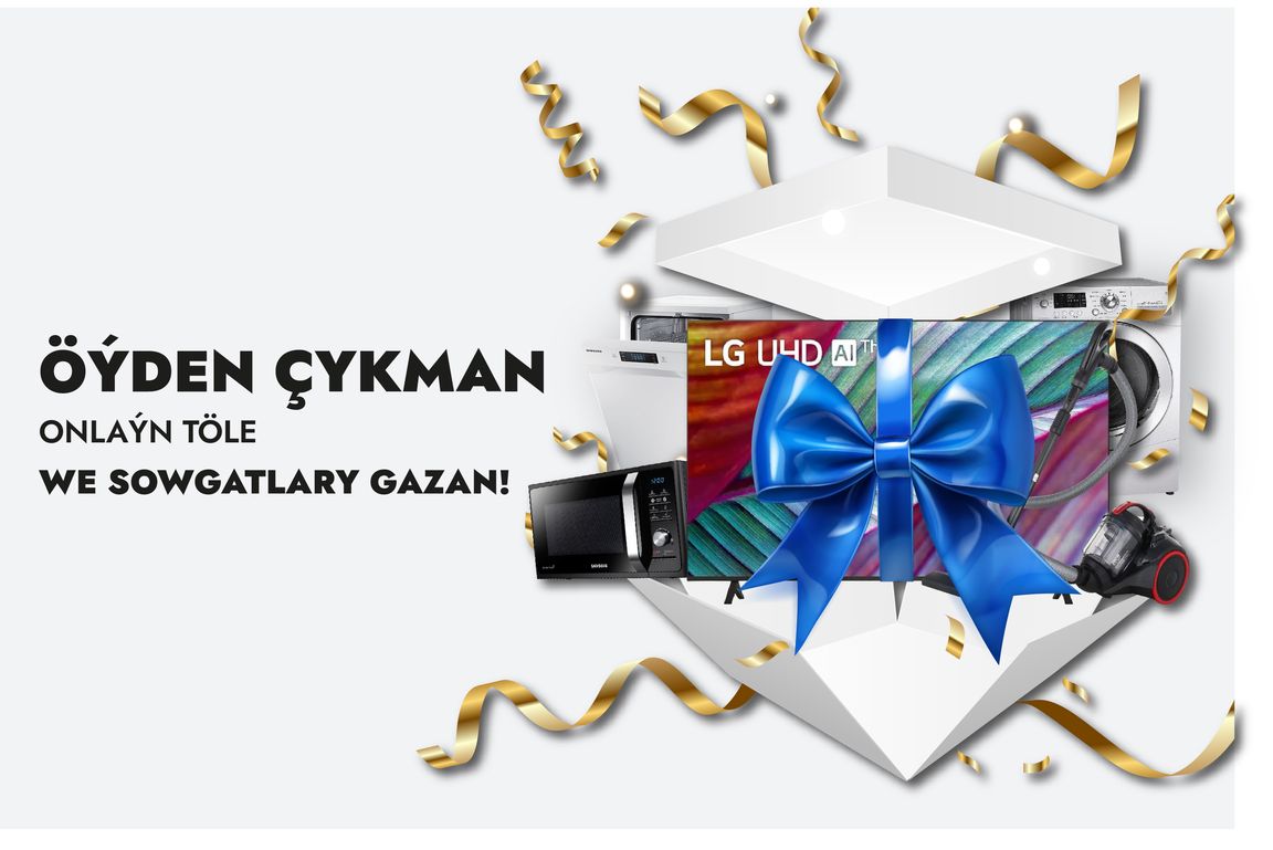 Mundan başga-da, satyn alan harydyňyzyň tölegini «Gerekli» mobil goşundysy arkaly onlaýn tölemek bilen, siz awtomatiki usulda utuşly bäsleşige gatnaşýarsyňyz. Baýraklaryň hatarynda: 65" ölçegli «LG» telewizory, «LG» kir ýuwujy maşyny, «Samsung» gap-gaç ýuwujy maşyny, «Samsung» mikrotolkunly peji hem-de «Samsung» tozan sorujysy bar.