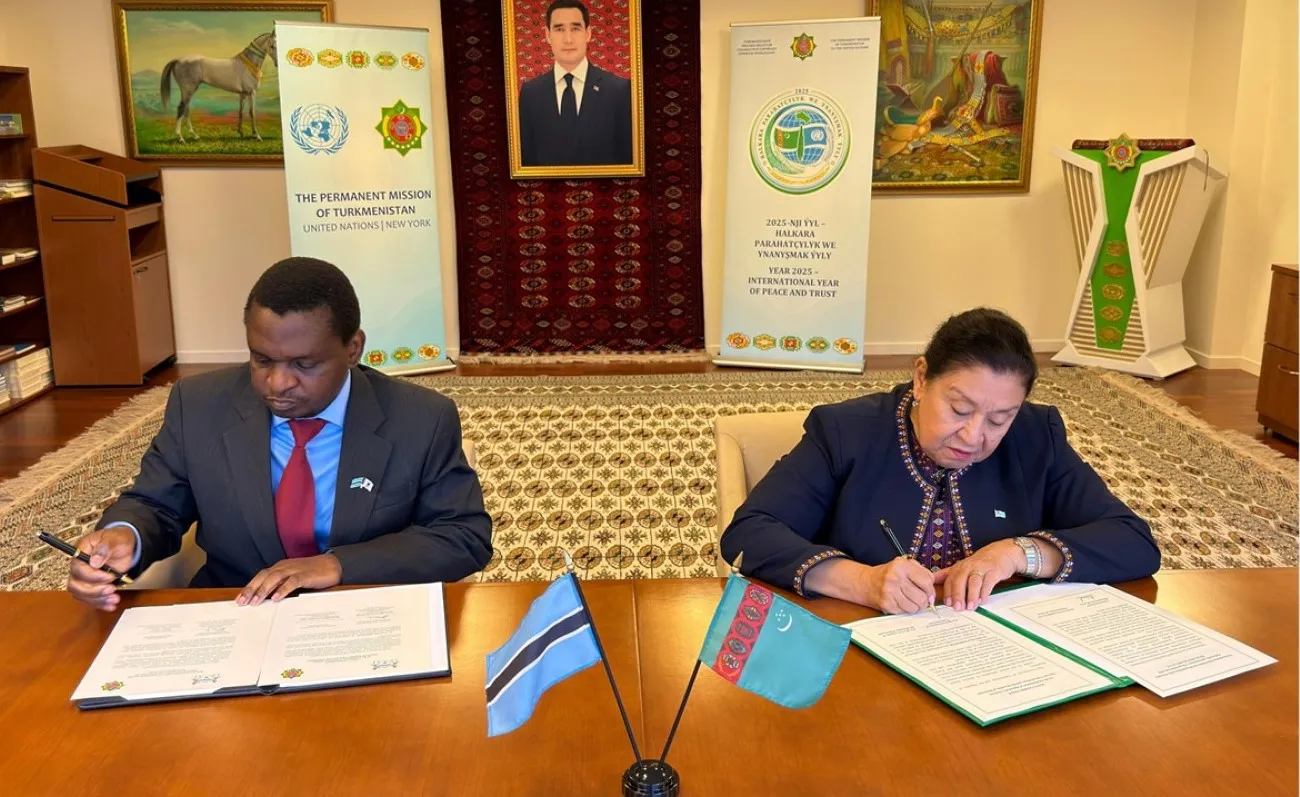 20-nji oktýabrda Nýu-Ýork şäherinde Türkmenistanyň Birleşen Milletler Guramasynyň ýanyndaky hemişelik wekilhanasynyň binasynda Türkmenistan bilen Botswana Respublikasynyň arasynda diplomatik gatnaşyklary ýola goýmak hakyndaky Bilelikdäki Beýanatyň gol çekişlik dabarasy geçirildi. Bu barada Türkmenistanyň DIM-niň resmi saýtynda habar berildi.