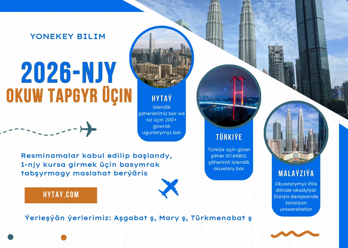 Bilim boýunça maslahat beriş (konsalting) hyzmatlarynda ýöriteleşen «Ýönekeý» hususy kärhanasy daşary ýurtlarda bilim almak ugurlaryny işjeň ösdürmegini dowam etdirýär hem-de 2026-njy ýyl üçin esasy mümkinçilikler barada dalaşgärleri habarly edýär.