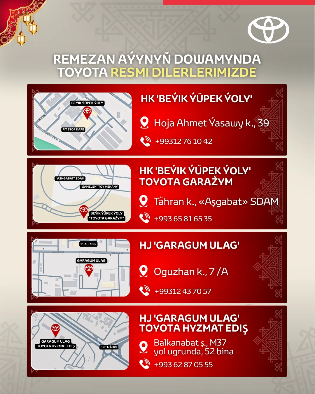 Aşgabat şäheri, «Aşgabat» söwda-dynç alyş merkezi, Tähran köçesi, «Toyota Garažym» — tel. +993 65 81 65 35