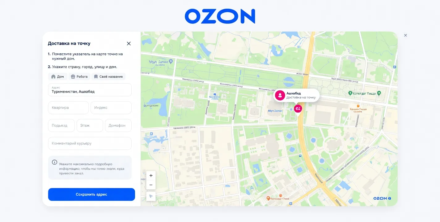 Russiýanyň iri «Ozon» marketpleýsiniň saýtynda we mobil goşundysynda eltip bermek hyzmaty bolan şäherleriň hatarynda Aşgabat peýda boldy. Türkmenistanyň paýtagtyndan bolan alyjylar üçin harytlaryň bahalary ABŞ-nyň dollarynda görkezilýär.