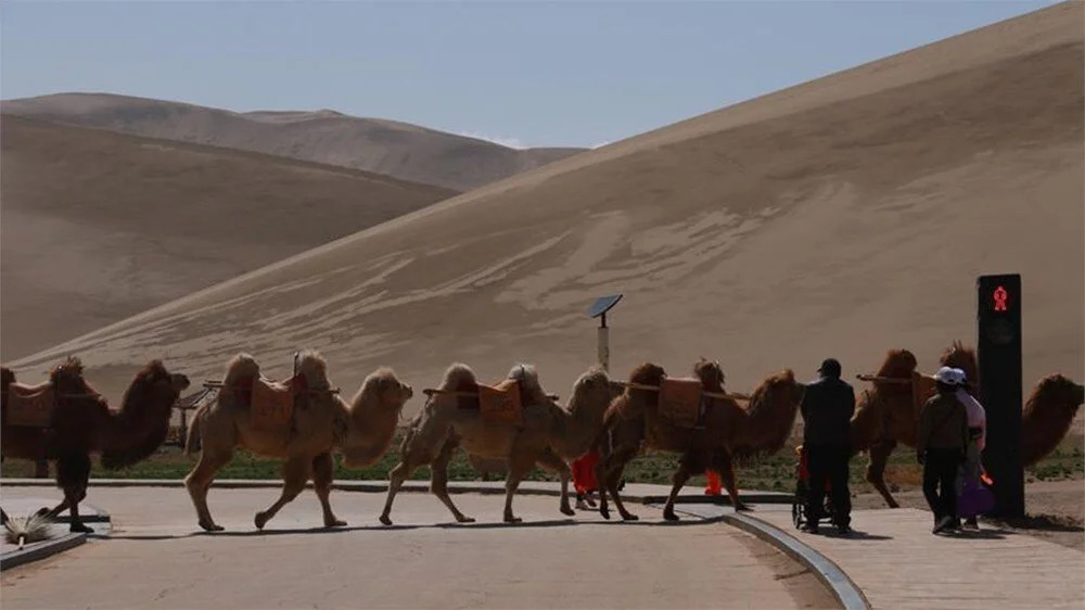 Çin’in Gansu bölgesindeki lambalar, bölgedeki develer ile turistlerin trafiğini düzenlemeye yarıyor.