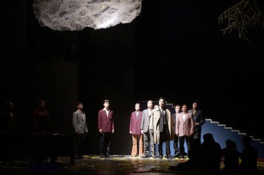 В спектакле нет диалогов, вместо них звучат стихи поэта и песни, исполняемые хором.