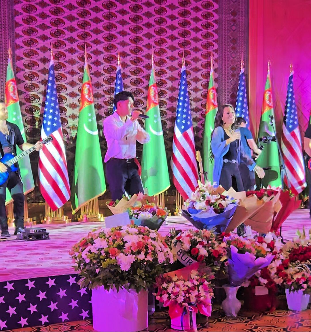 В продолжение праздничного вечера американская кантри-рок группа и артистка Джессика Линн исполняли зажигательные хиты, в этом их поддержали туркменские певцы.
