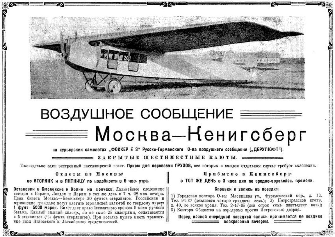 А уже 10 мая 1922 года с помощью русско-германского общества воздушных сообщений «Дерулуфт» состоялся первый полет с пассажирами. Первыми частными пассажирами стали поэт Сергей Есенин и танцовщица Айседора Дункан, отправившиеся в свадебное путешествие. А советский поэт Владимир Маяковский написал стих «Москва-Кенигсберг» после своей поездки 3 июля 1923 года.