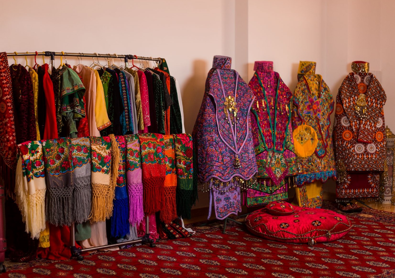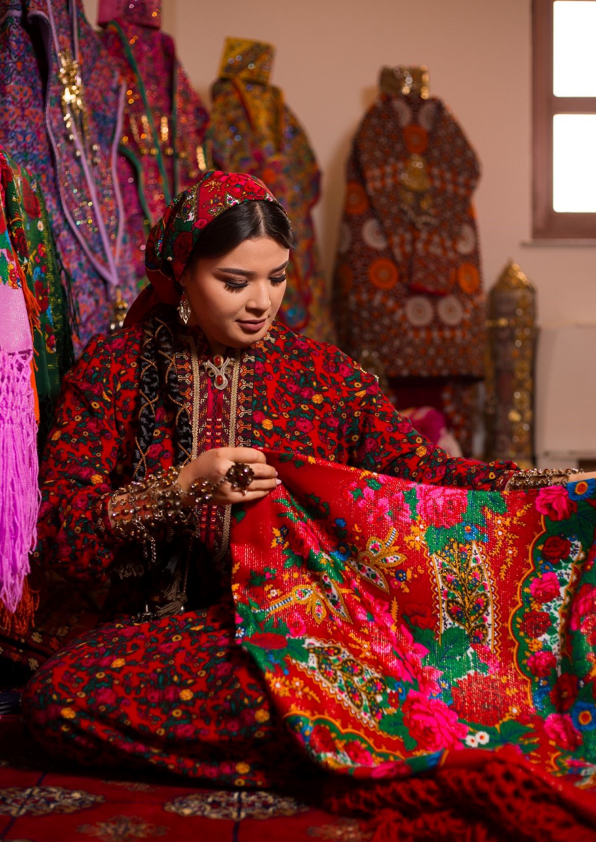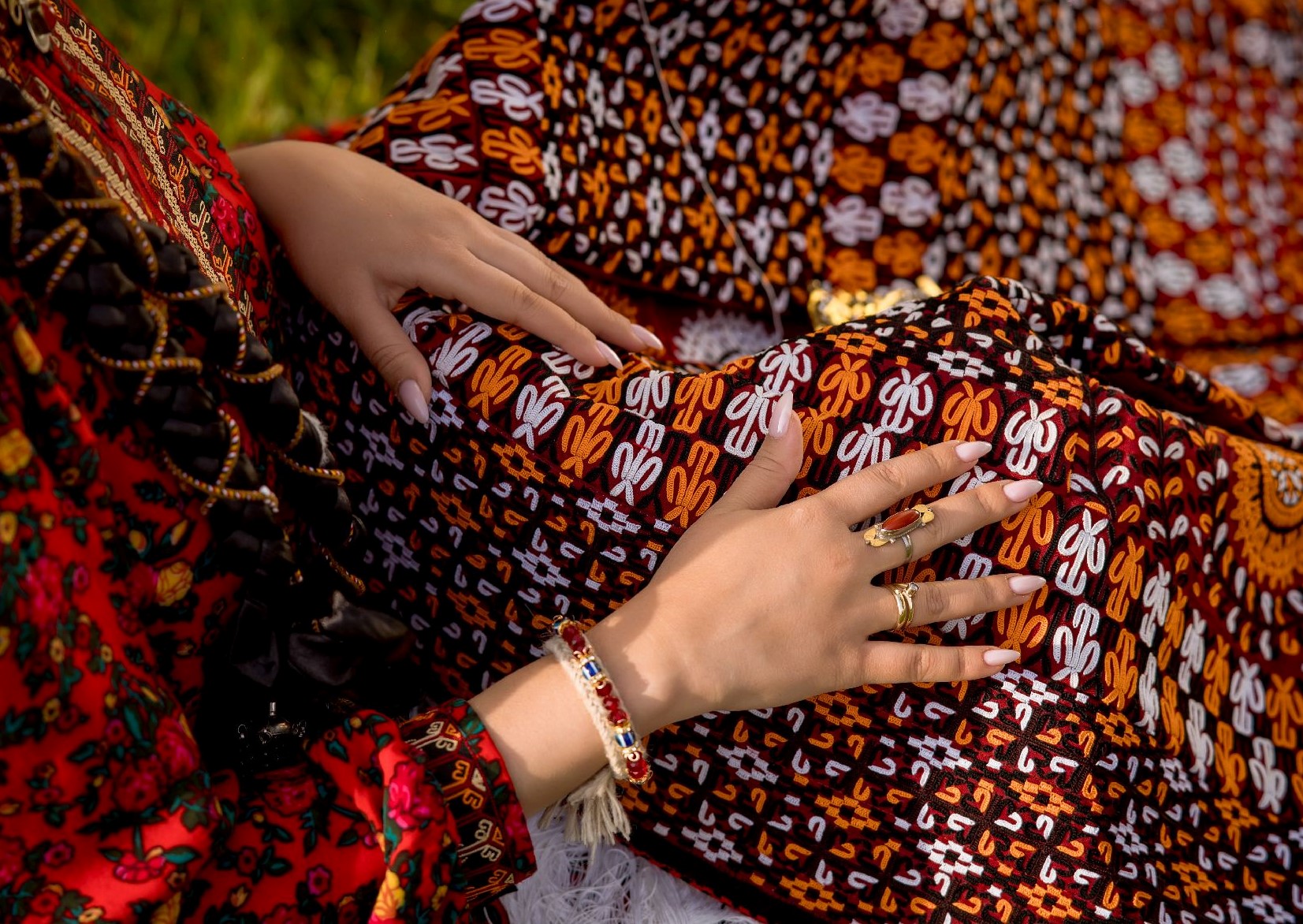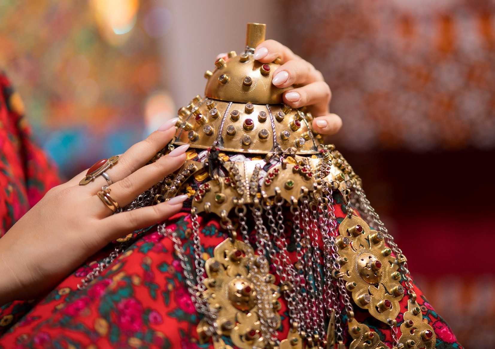 Самая интересная и красочная часть начинается на следующий день. С утра невесту наряжают в национальный наряд – красное платье из шелковой ткани кетени и богато расшитый халат. И халат, и платье обильно украшают массивные серебряные украшения. Довольно часто, впрочем, эти свадебные украшения сделаны из меди – они значительно легче серебряных и стоят намного дешевле. Также одно из новых правил – брать такие украшения напрокат. Национальный наряд невесты со всеми украшениями может весить более 25 килограммов, а полный вес комплекта всех традиционных украшений невесты, включая накосные подвески, браслеты, брошь «гульяка» и прочее из серебра мог достигать 60 кг.