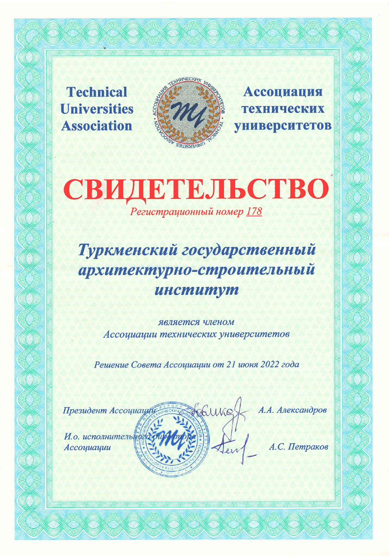 The Turkmen State Institute of Architecture and Construction has recently received a certificate confirming its membership in the Association of Technical Universities. This is reported by the publication "Turkmenistan: Golden Age".