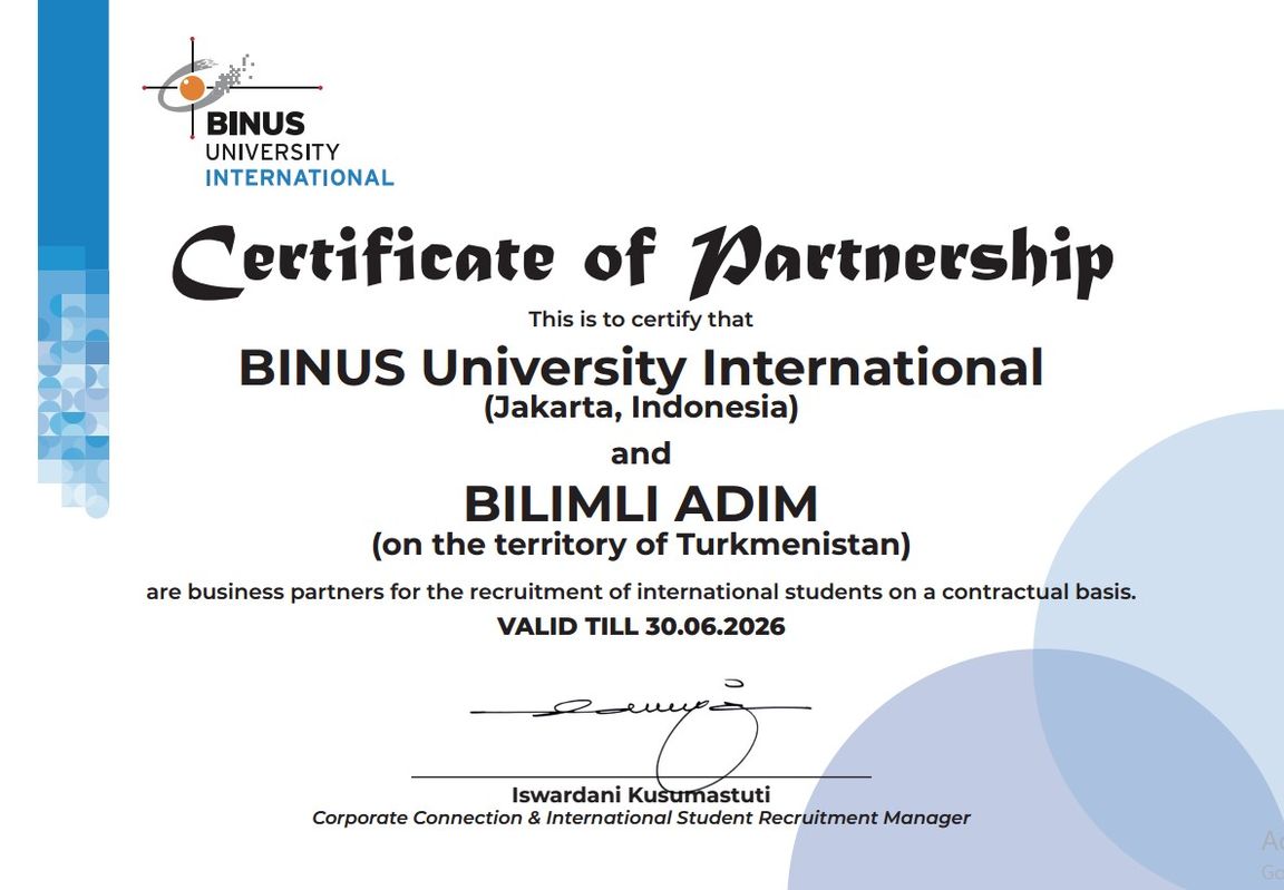Turkmen consulting company Bilimli ädim has signed a representative agreement with one of Indonesia's leading private universities, Bina Nusantara University (BINUS). This partnership opens up new opportunities for Turkmen students to pursue higher education in Southeast Asia.