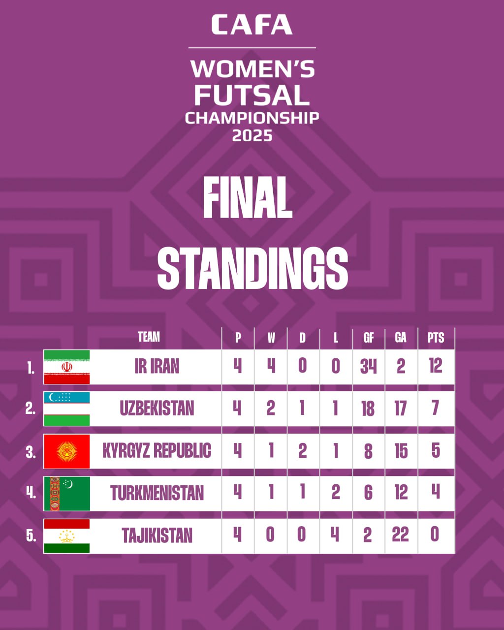 The silver medalist of CAFA-2025 was the team from Uzbekistan (7 points), the bronze medals were awarded to the futsal players from Kyrgyzstan (5), the representatives of Turkmenistan finished fourth (4), and the players of the Tajikistan team closed the tournament table, having scored no points.