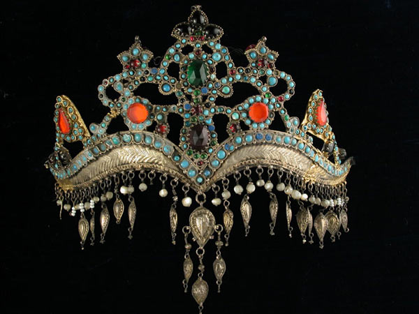 One of the popular and original headwear worn by Uzbek and Tajik women is the “tillya-kosh” tiara (or “kostillo” in Tajik). This name can be translated as “golden eyebrows”. The lower part of the tiara seems to follow the curve of the eyebrows of the oriental beauty; it is decorated with silver pendants, and the tiara itself was made in the form of an elegant crown, decorated with stones and colored glass.