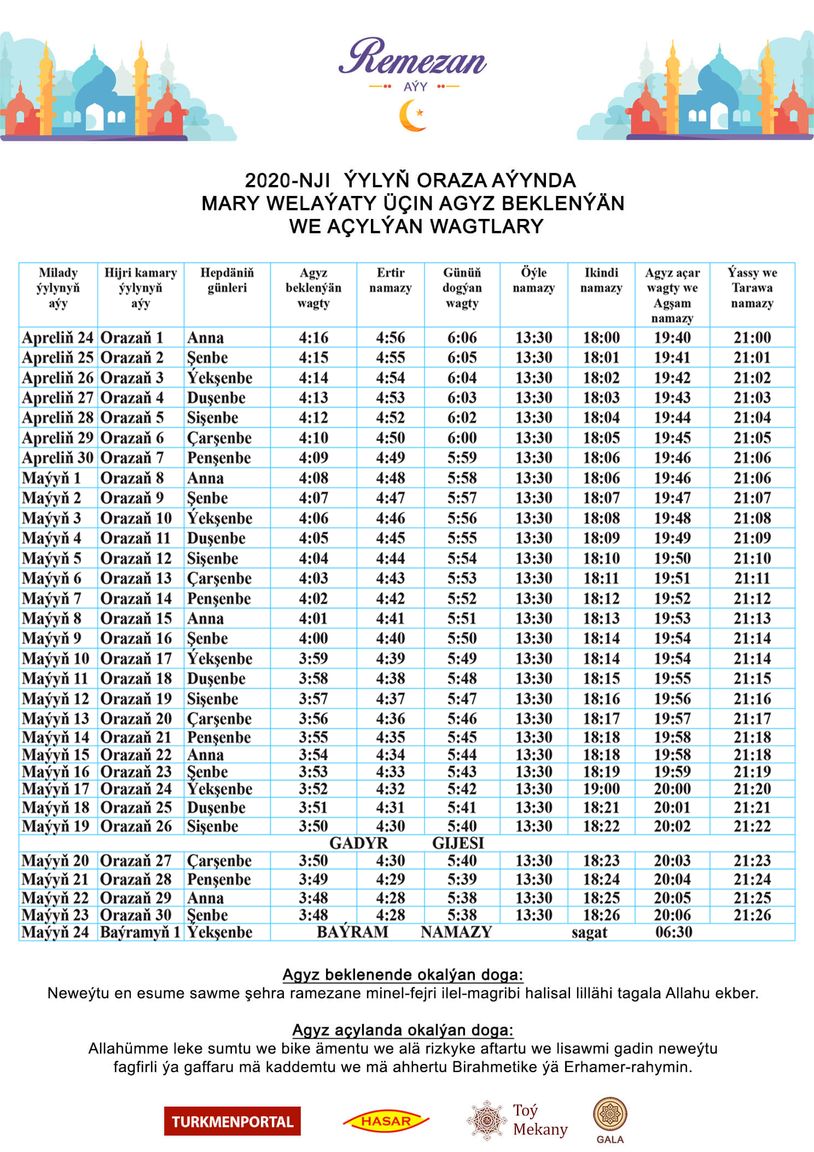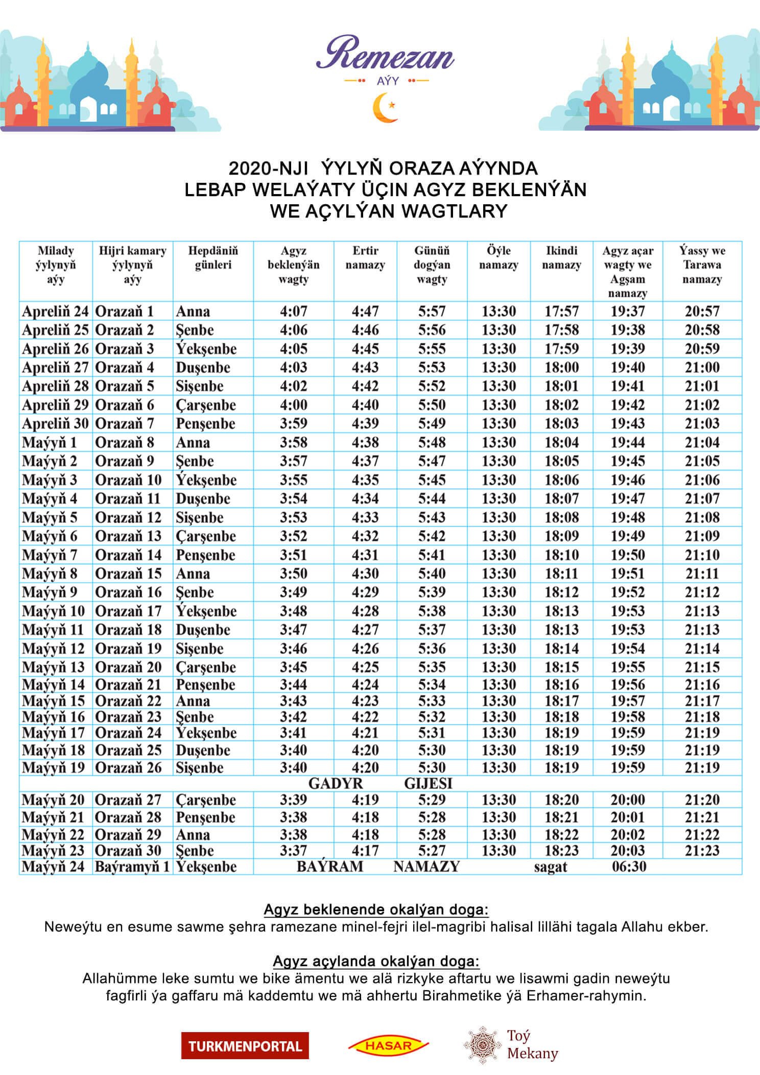 Ramadan calendar of suhoor time and iftar time for Turkmenistan (2020) | Turkmenportal.com