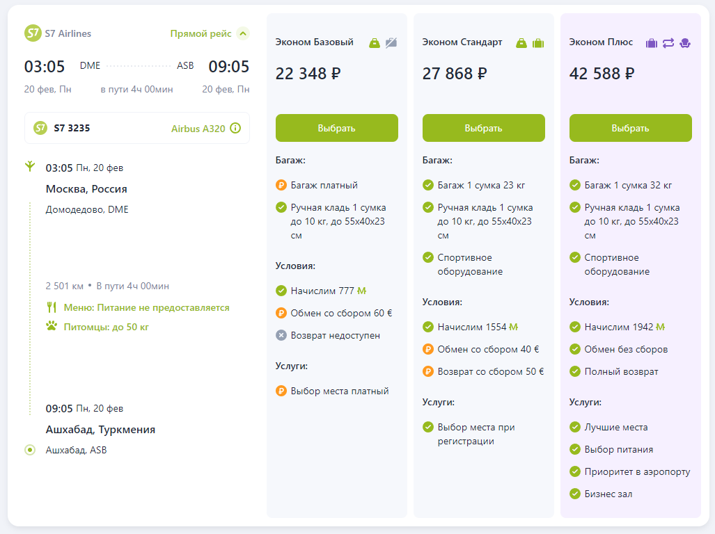 One-way tickets from Moscow to Ashgabat cost from 22,348 rubles without luggage and 27,868 with luggage (as of February 17, 2023).