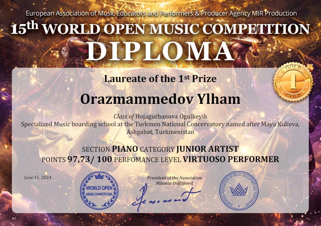 At the 15th World Open Music Competition, organized by the European Association of Music Teachers and Performers together with the MIR Production Production Agency, Ylham was awarded the title of 1st degree laureate in the piano section, category “Young Artist”.