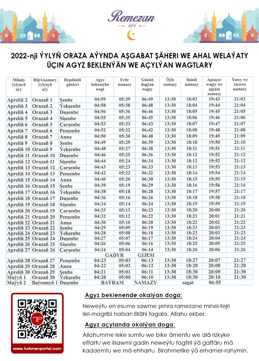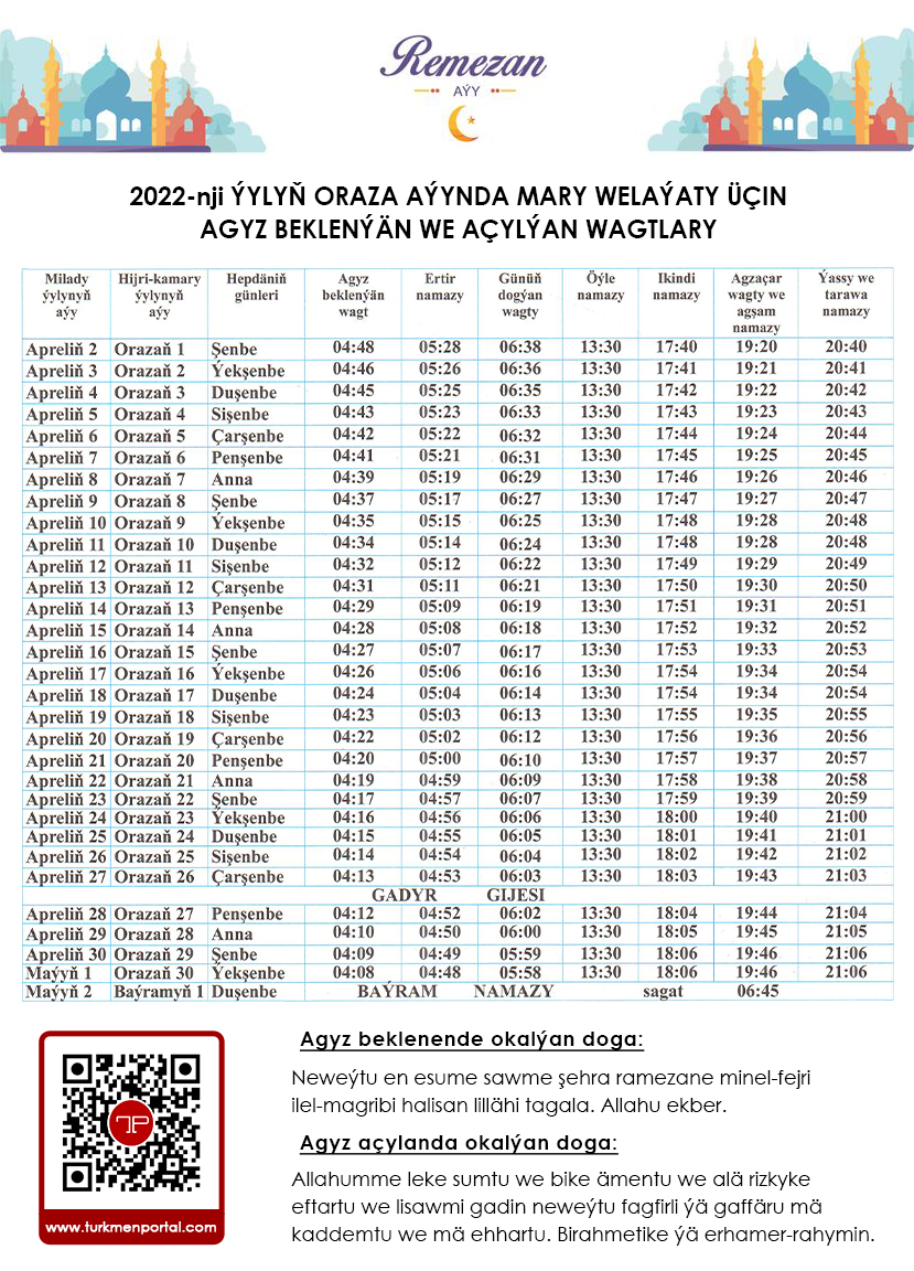Расписание сухуров и ифтаров в пост Рамадан 2022 года (Туркменистан)