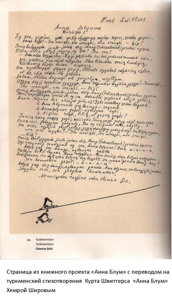 Так случилось, что в Туркменском государственном университете приезжими немецкими специалистами проводился семинар, посвященный нетрадиционным формам стихосложения. Когда речь зашла о стихографике, один из специалистов стал рассказывать о немецком модернисте Курте Швиттерсе, которого, хоть и нет в живых, но поэзия нашла много поклонников и продолжателей этого жанра. Тогда слово взял один из туркменских педагогов-филологов, заявив, что в Туркменистане тоже есть поэт, который активно работает в этом направлении, более того, он жив и здоров. Удивлению и восторгу немецких специалистов не было предела. Они с величайшим удовольствием познакомились с туркменским поэтом и его модернистскими произведениями. Уже в 2000 году на Международной выставке ЭКСПО-2000 в Мюнхене постеры со стихографикой Хемры Широва украсили павильон «Новые поиски», посвященный литературе. А некоторое время спустя в Кёльне (Германия) увидел свет книжный проект «Анна», о котором хочется рассказать подробнее. Сборник «Анна» представляет собой книгу одного стихотворения Курта Швиттерса «Анна Блум», в 157 поэтических переводах поэтов-модернистов из 137 стран мира. Уникальность книги и в том, что все переводы опубликованы в оригинальном оформлении, а именно так, как они написаны поэтами – большинство из них от руки, и в том, что к сборнику прилагается СД-диск с голосами поэтов, читающих переводы «Анны Блум» на родном языке. Так вот, в числе 157 поэтов-модернистов в сборнике мы можем найти имя и голос Хемры Широва и его великолепный перевод «Анны Блум» на туркменский язык.