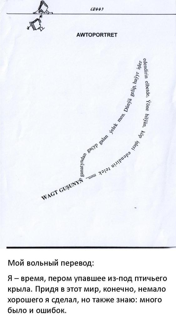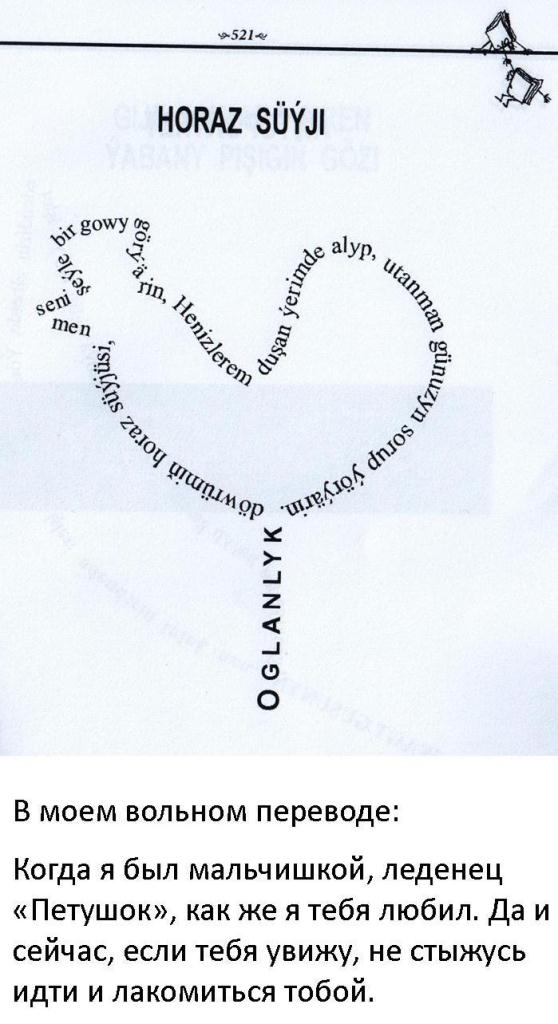 Работая в разных литературных жанрах, он всегда стремился идти в ногу со временем, осваивать новые пространства для созидания. Не удивительно, что его в творчестве немало произведений, созданных в жанре визуального стихосложения. Можно сказать, он единственный туркменский поэт, кто сочиняет в этом жанре. Например, вы когда-нибудь видели ковер, который хочет продать женщина, глазами ее маленького сынишки? Вот он, пожалуйста, в стихографике поэта – вместо гёлей на нем печенье и шоколадные плитки.
