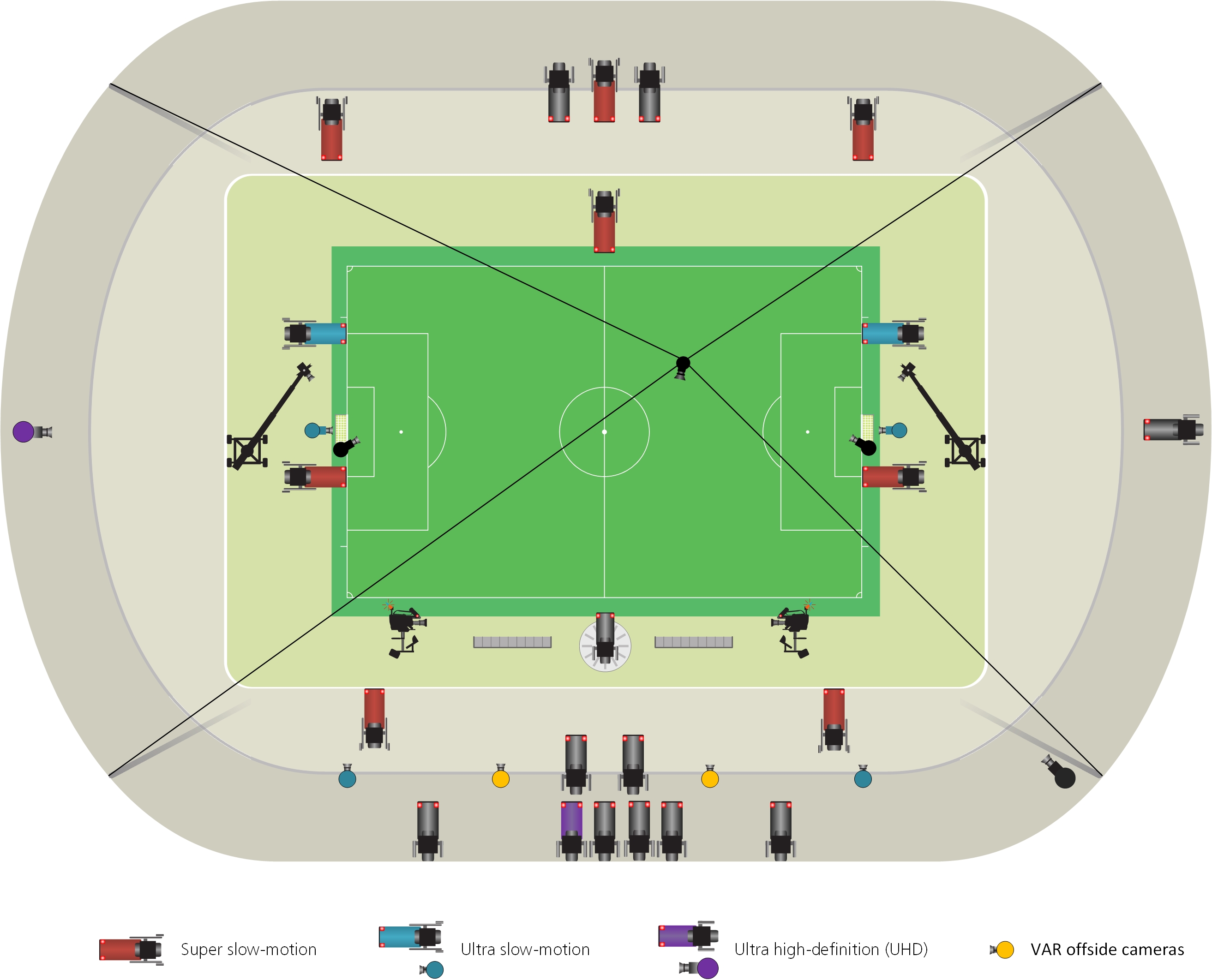 Бригада видеопомощи судье имеет доступ к 33 вещательным камерам, восемь из которых являются камерами суперзамедленного воспроизведения, а четыре из них – камерами ультразамедленного воспроизведения. Кроме этого, у команды имеется доступ к двум камерам для определения положения «вне игры», доступ к которым имеется у бригады видеопомощи судье.